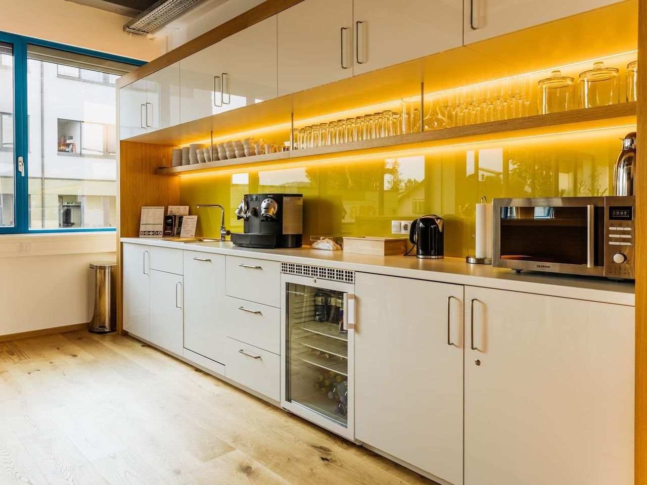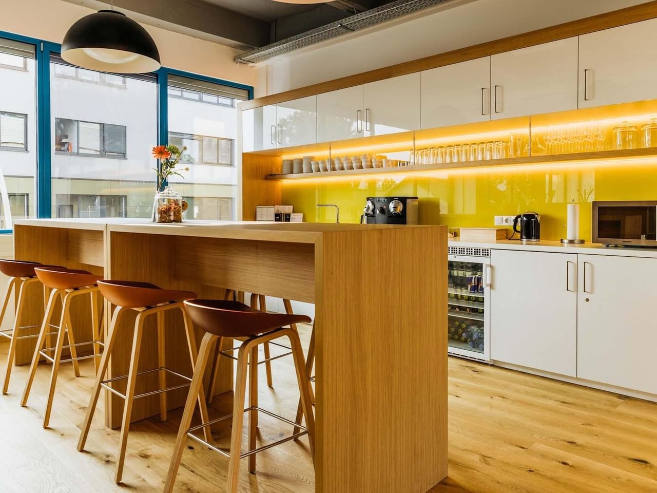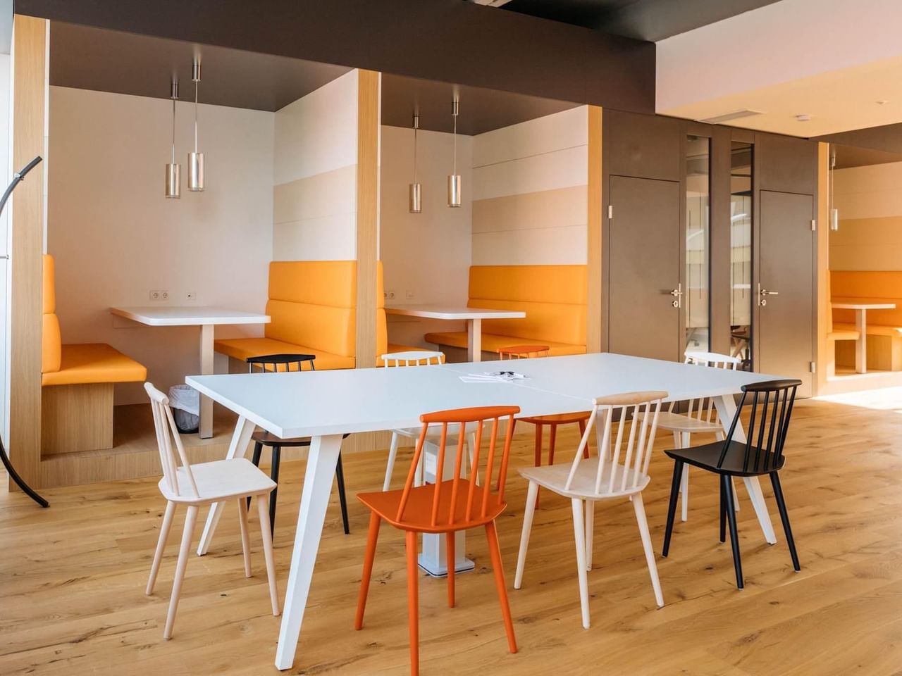 Vous vous sentirez inspiré dès que vous entrerez dans l'espace de travail, grâce à sa palette de couleurs automnales chaleureuses, à son mobilier ultramoderne et à la lumière naturelle qui l'éclaire.