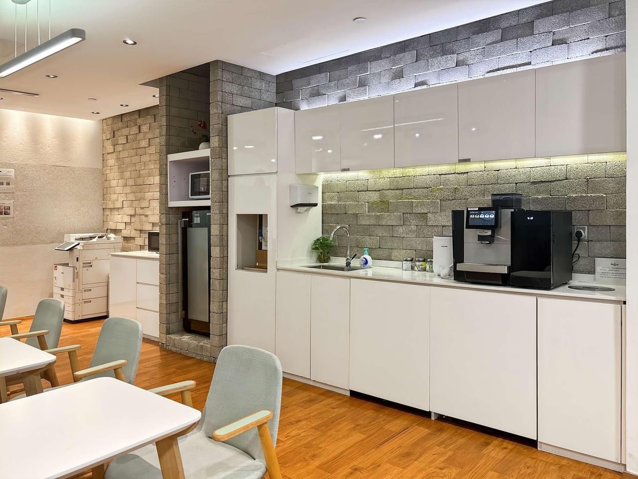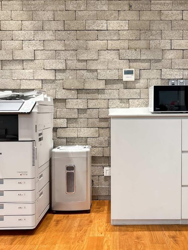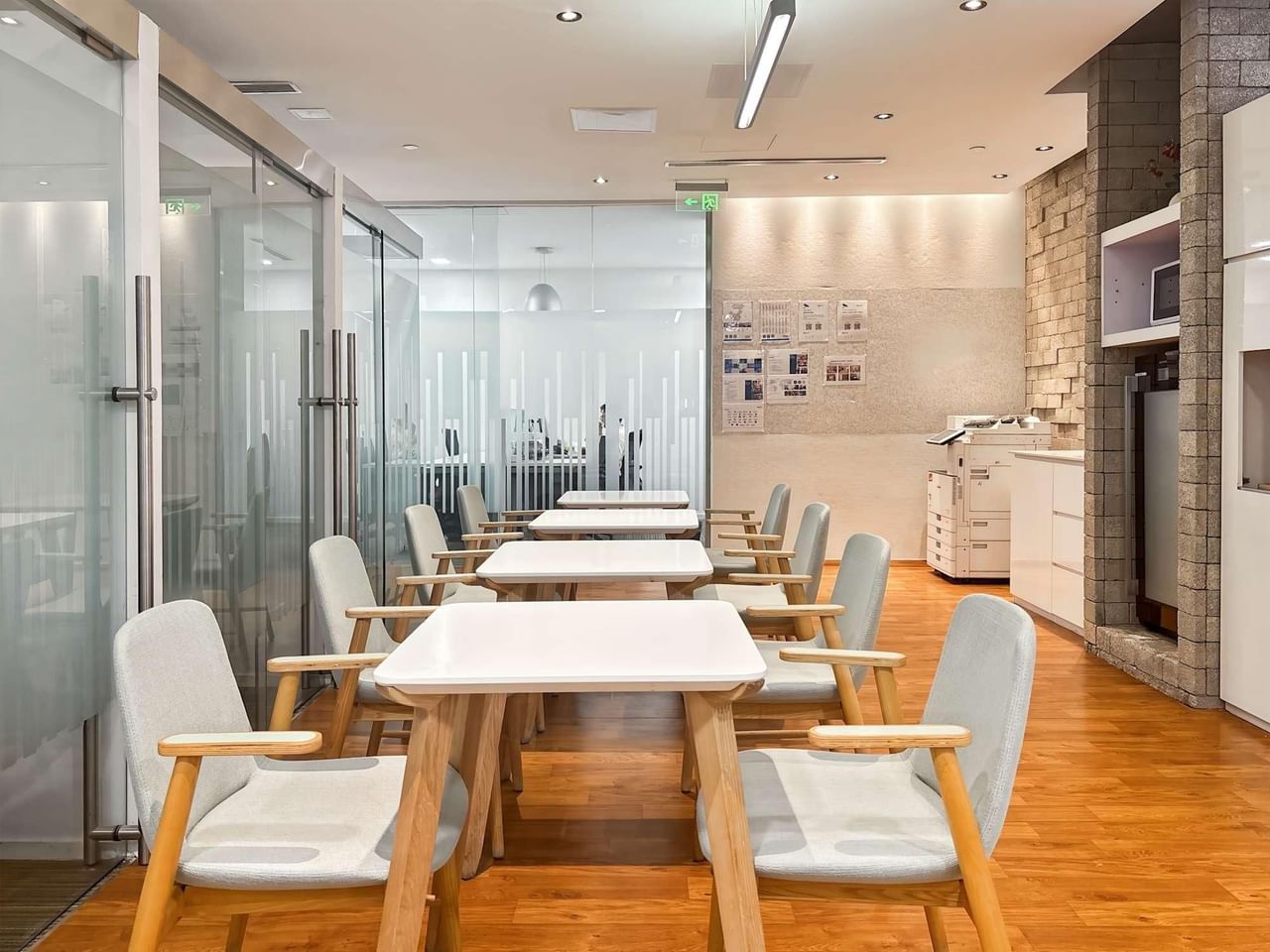 Travaillez efficacement dans des bureaux élégants décorés dans des tons apaisants et retrouvez-vous dans les espaces communs dotés d'un plancher en bois.