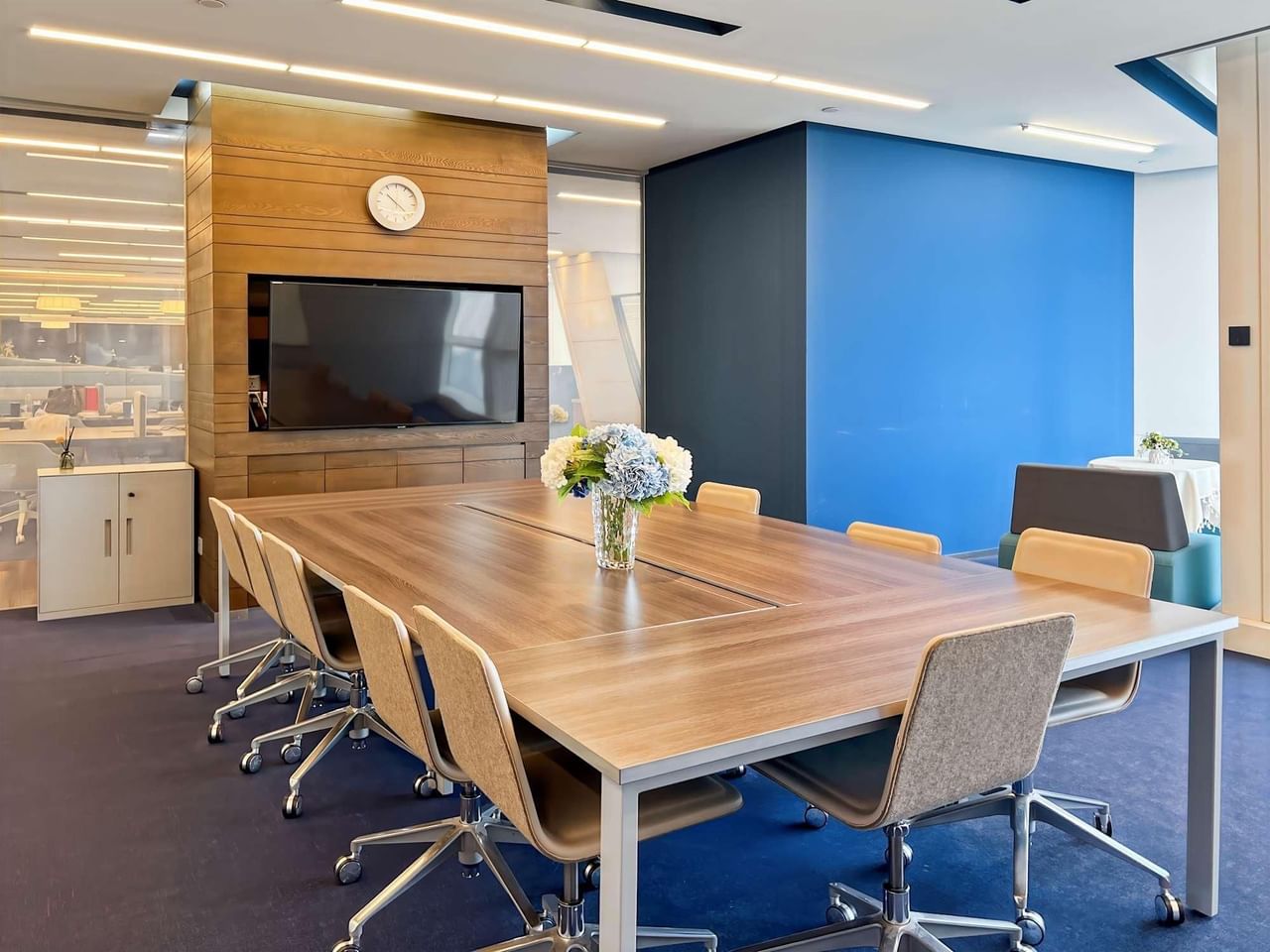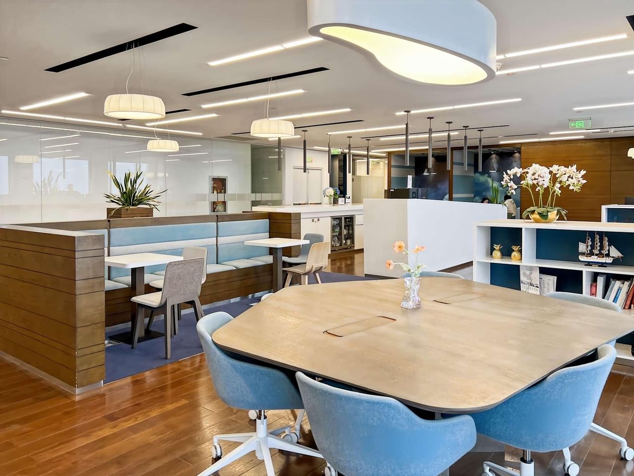 Les grandes fenêtres de notre espace de travail Ping An International offrent une vue imprenable sur l'architecture moderne de la ville et permettent de se retrouver entre collègues dans des espaces communs spacieux au plancher en bois.