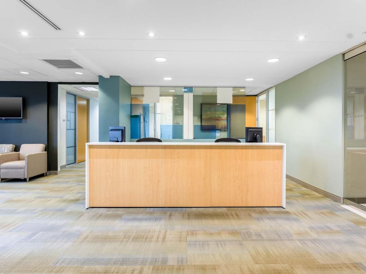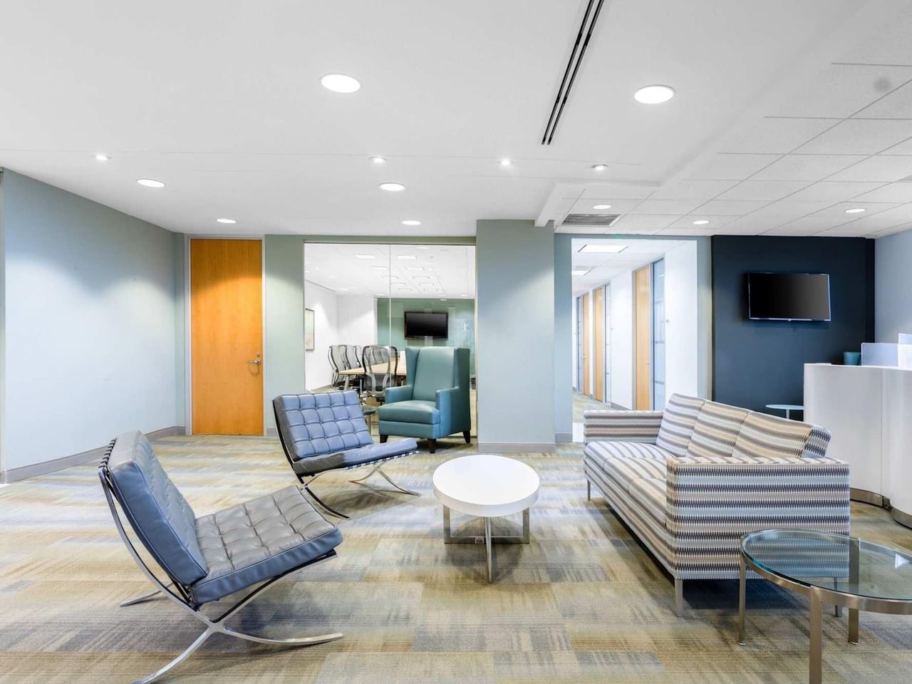 Le 1560 Sawgrass Corporate Park, bordé de palmiers, est d'un rose-orange ensoleillé à l'extérieur, tandis que les intérieurs sont un mélange de bon goût de bleus et de bruns, de papier peint aux motifs tourbillonnants et de bureaux en bois pâle.