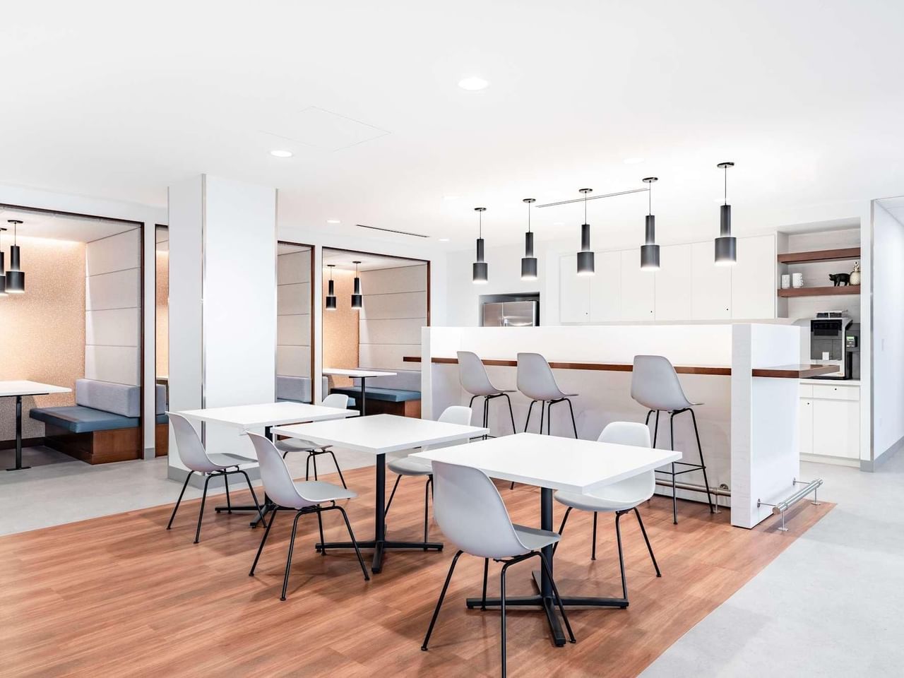 Un élégant salon d'affaires avec vue sur la ligne d'horizon de Chicago est le cadre idéal pour impressionner les clients, tandis que le bar à café sur place est l'endroit idéal pour faire une pause.