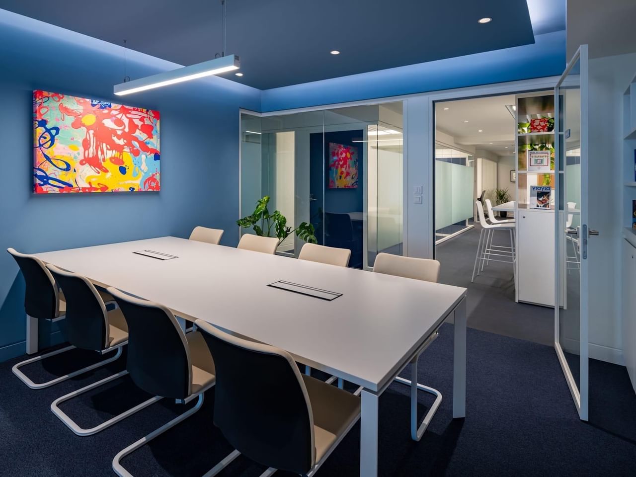 Si vous accueillez des clients au bureau ou si vous avez besoin de vous connecter à distance, optez pour notre élégante salle de réunion, équipée de matériel de présentation et de technologie de vidéoconférence.