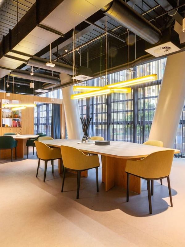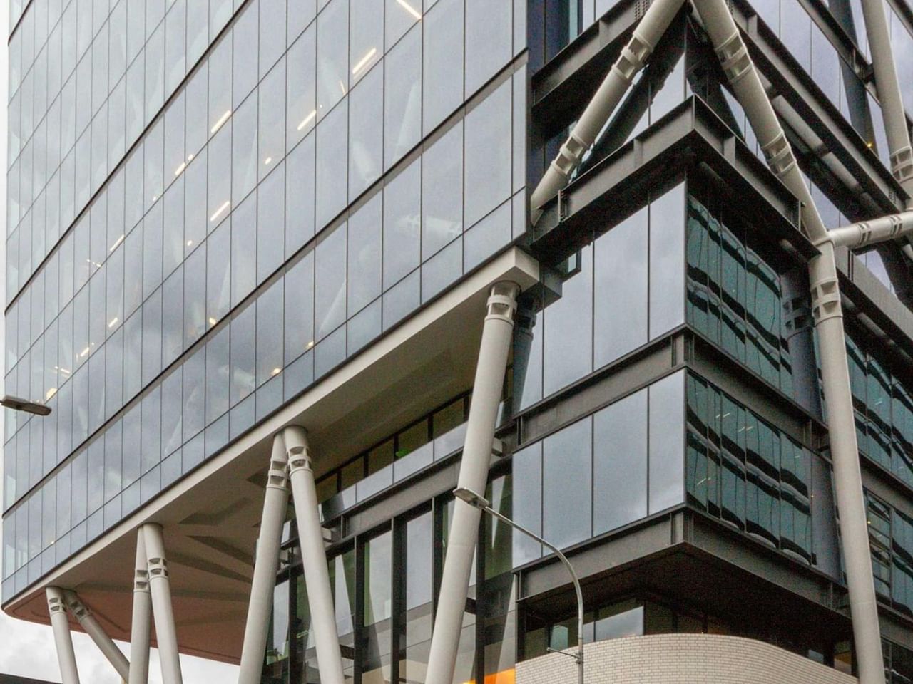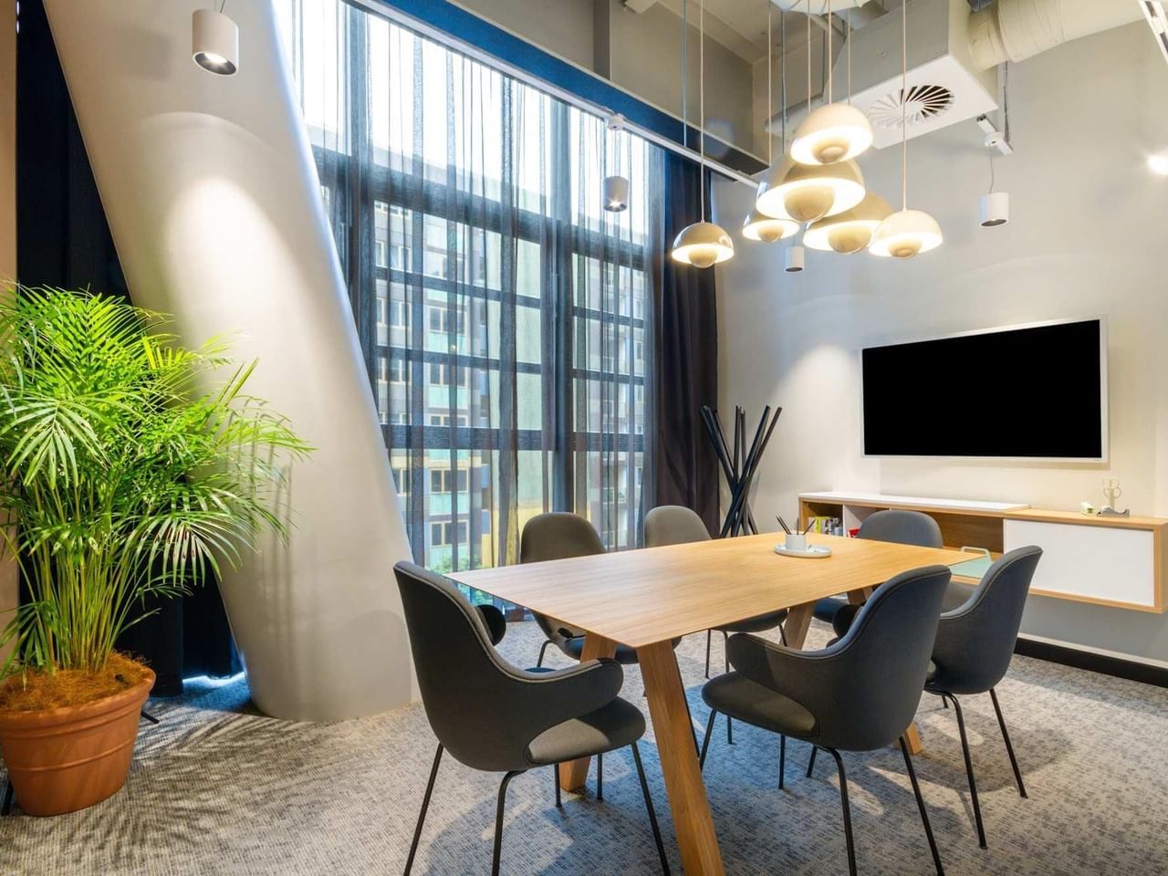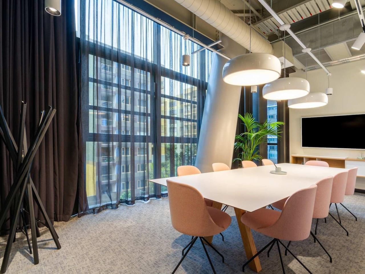 Genießen Sie von Ihrem Schreibtisch aus die Aussicht auf die Skyline und tüfteln Sie in modernen, grau getönten Besprechungsräumen.