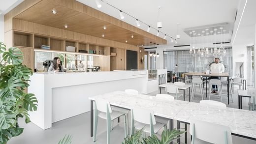 Drinnen werden Sie vom hellen und modernen Interieur, den bodentiefen Fenstern und den gemütlichen Gemeinschaftsbereichen beeindruckt sein.