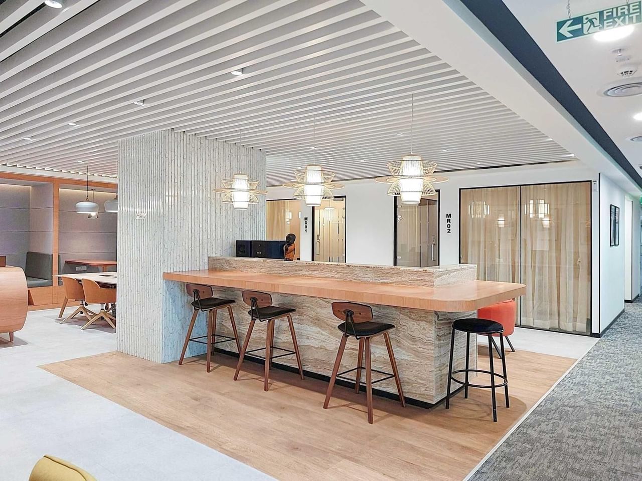 Arbeiten Sie in voll möblierten, skalierbaren Büroräumen mit einer Lounge-Bar, in der Sie nach der Arbeit entspannen können.