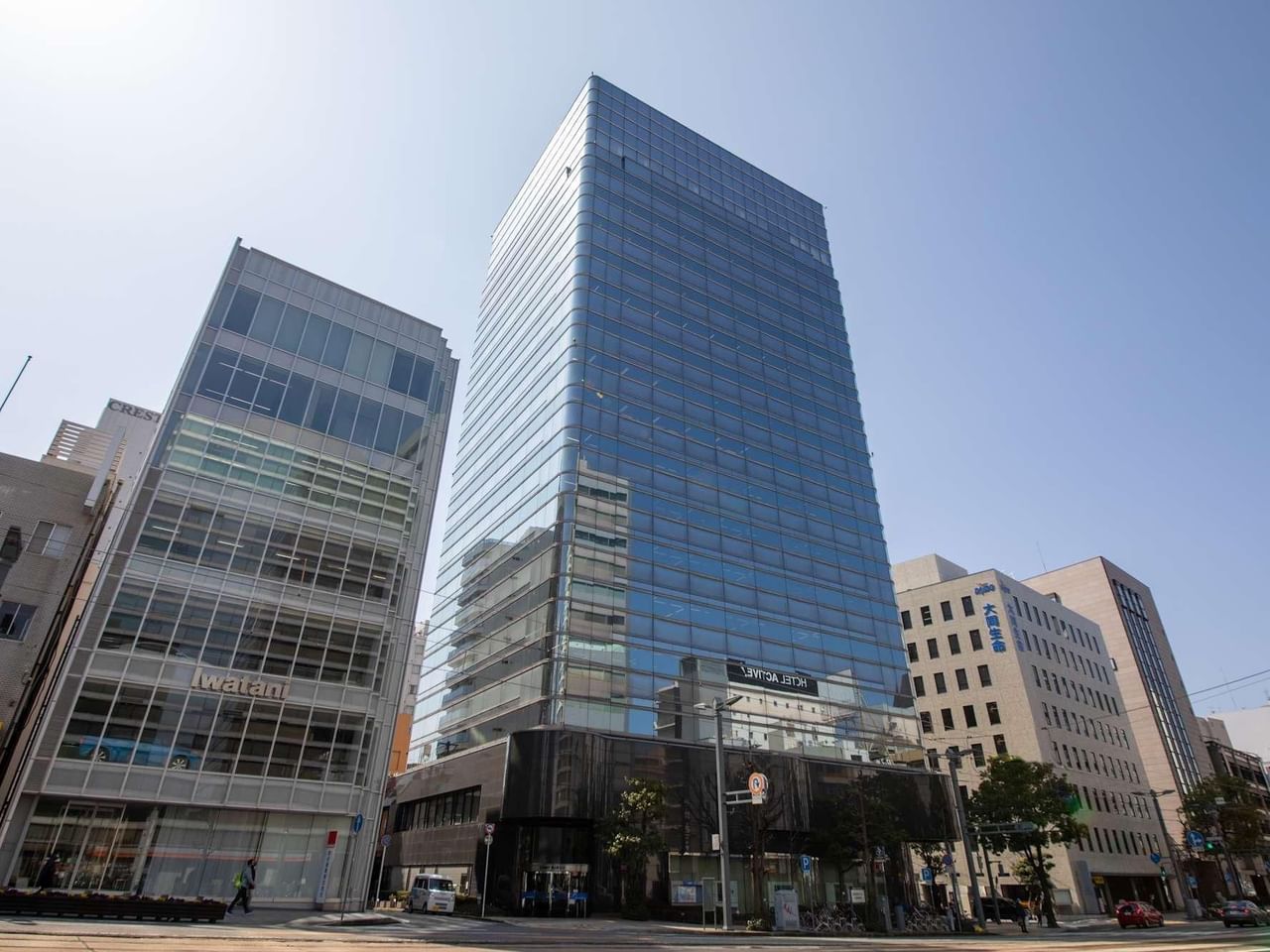 Das Hiroshima High Building, das von der Stadt für seine hervorragende Architektur anerkannt wird, bietet von seinen modernen Arbeitsräumen aus eine hervorragende Aussicht auf den nahe gelegenen Fluss Kyobashi.