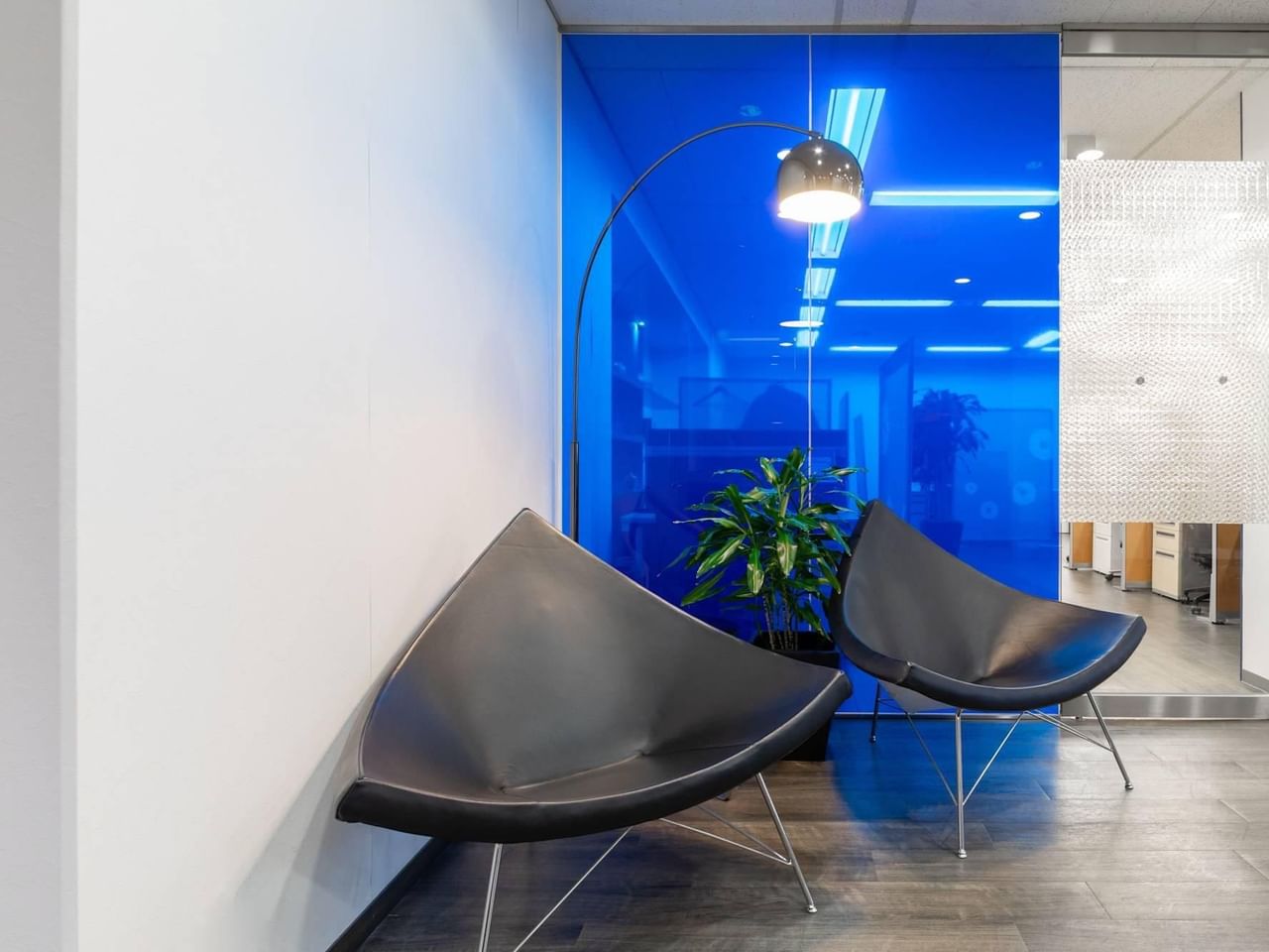 Bringen Sie Arbeit und Erholung in einem stilvollen Büro mit komfortablen Gemeinschaftsbereichen und einer Café-Bar unter einen Hut.