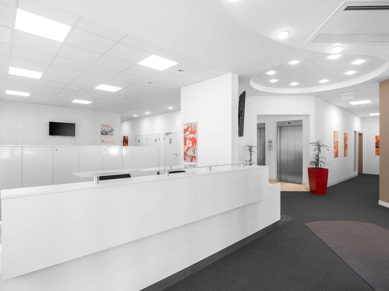 Arbeiten Sie in diesem zeitgemäßen Gebäude, das außen durch sein poliertes Mauerwerk und innen durch sein modernes, stilvolles Design besticht.