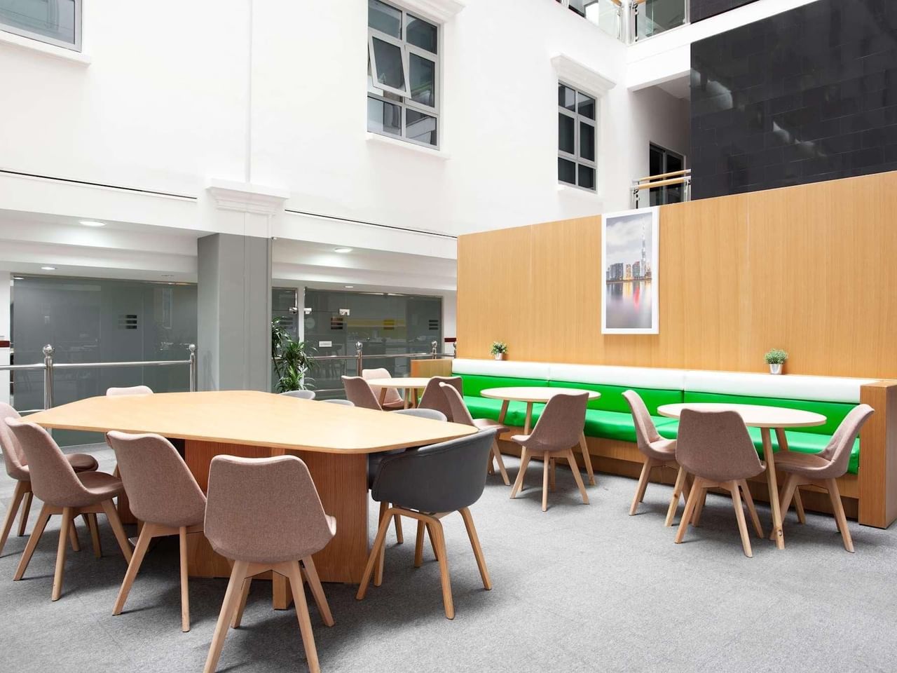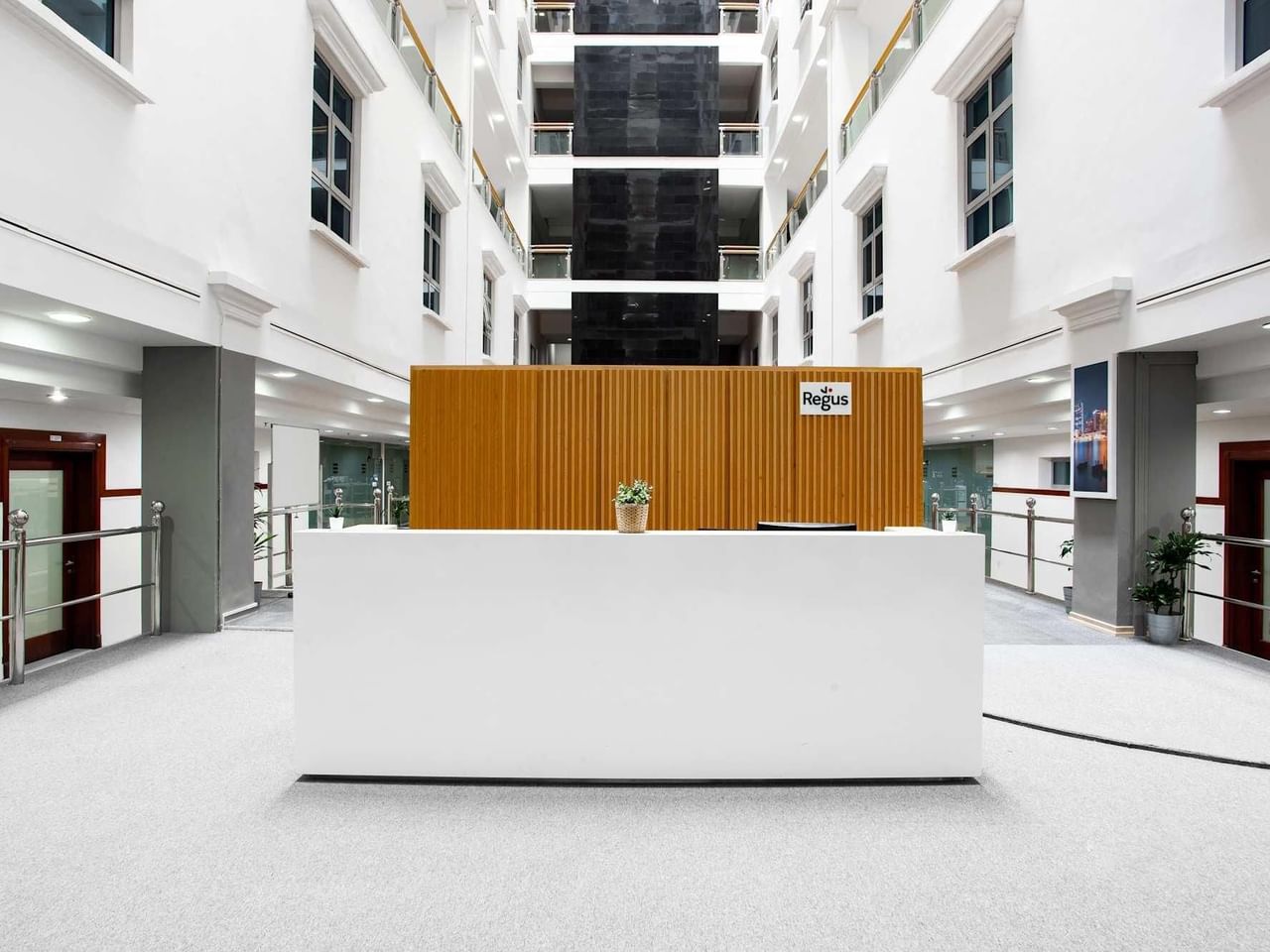 Mit seinem unverwechselbaren gewölbten Glasdesign und dem makellosen weißen Empfangsbereich ist dieses Gebäude ein beeindruckender Ort, um Kunden zu empfangen.