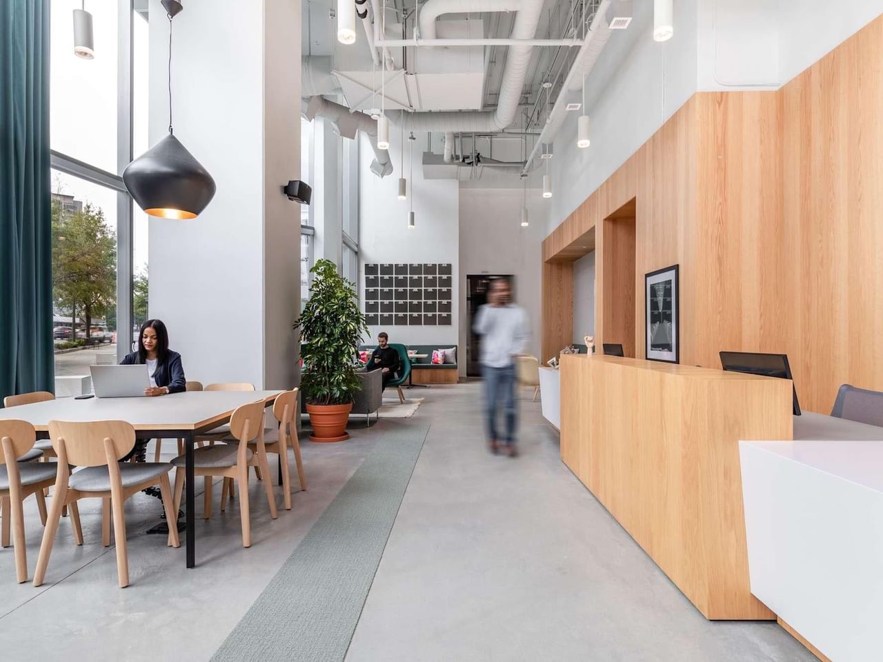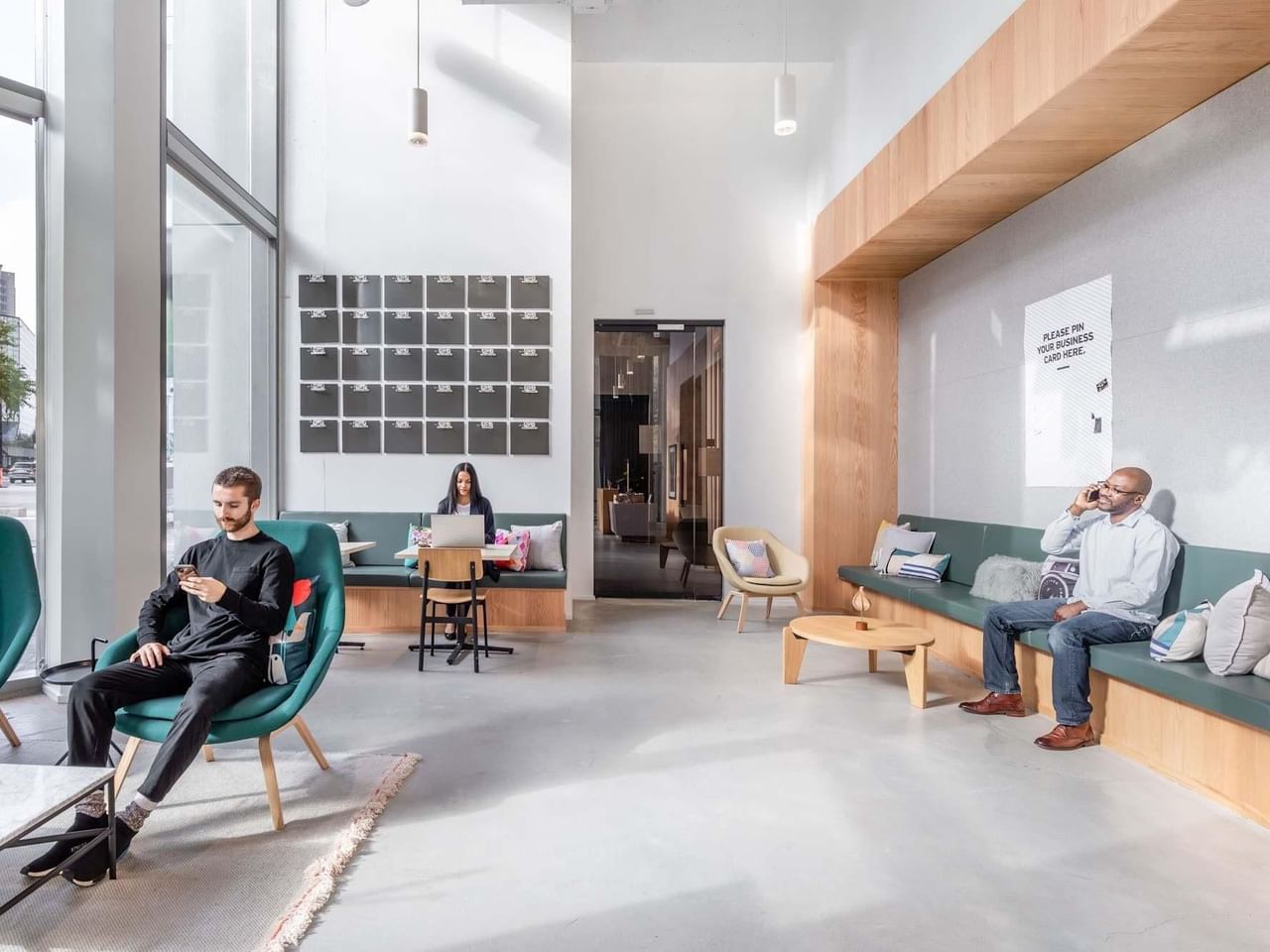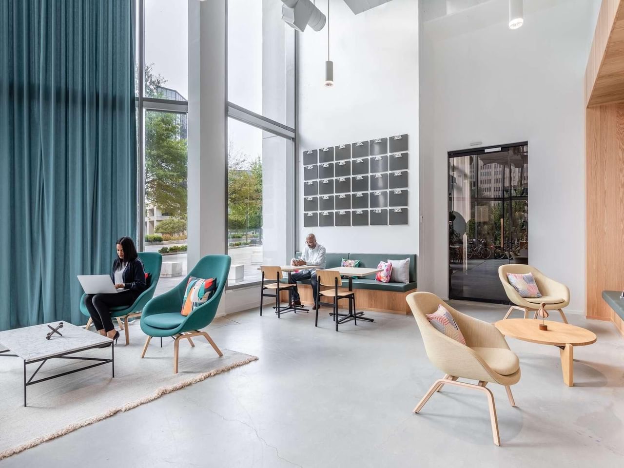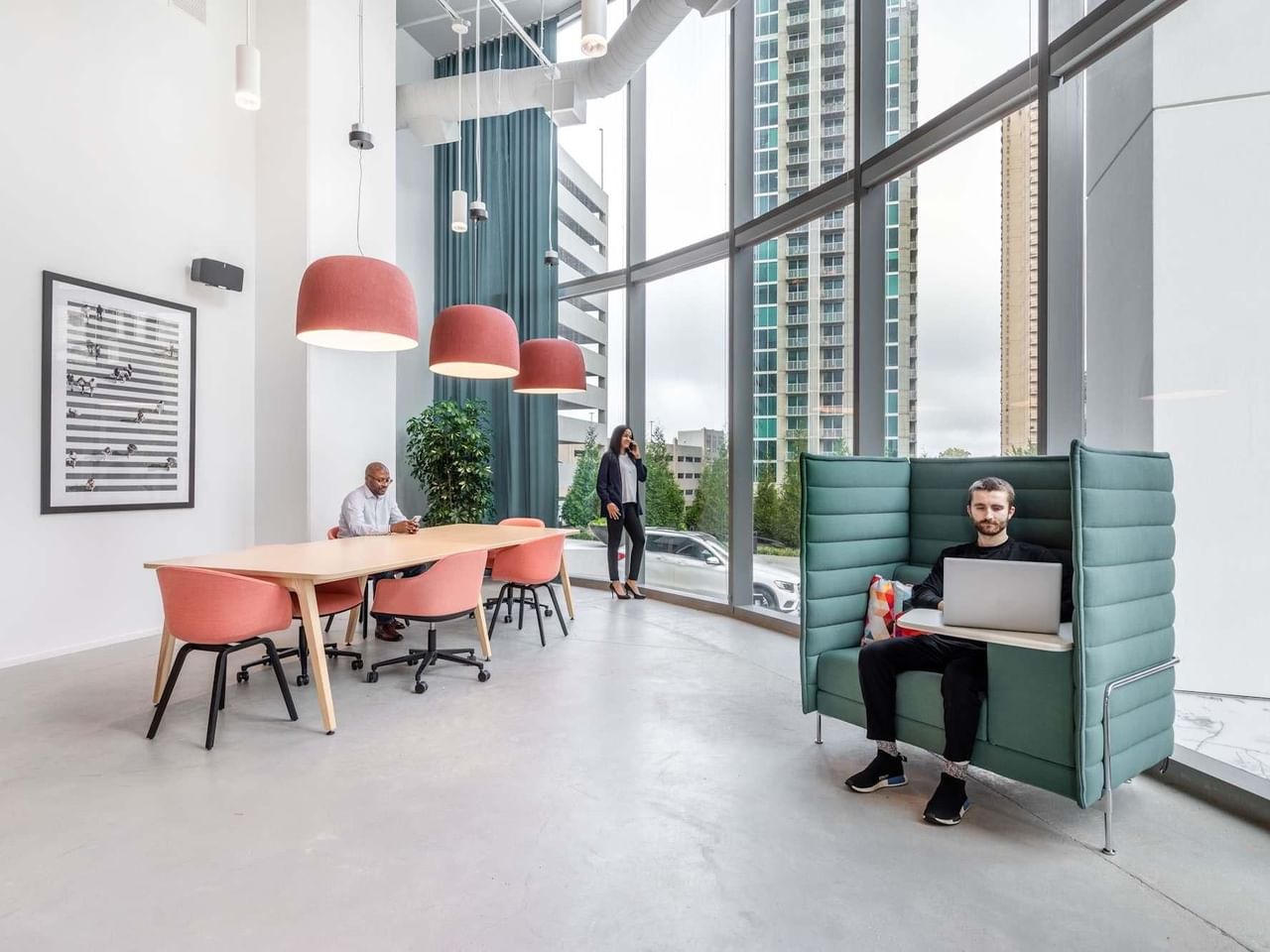 Dieses Büro in Atlanta verfügt über ein Loft-ähnliches Design, wobei sich die Arbeitsbereiche im ersten bis dritten Stock des Gebäudes befinden, so dass Sie den perfekten Coworking- oder Gemeinschaftsbüroplatz finden können.