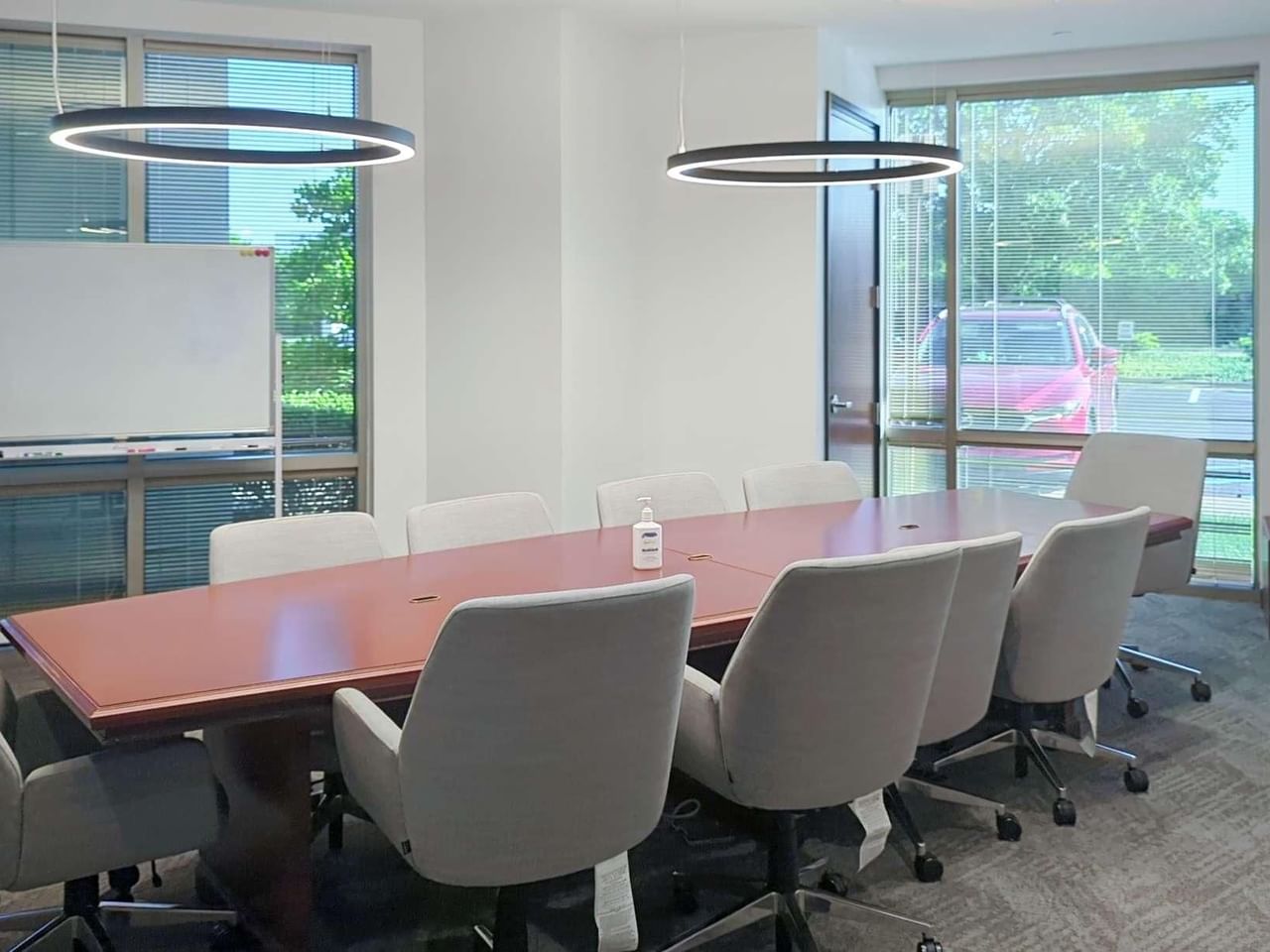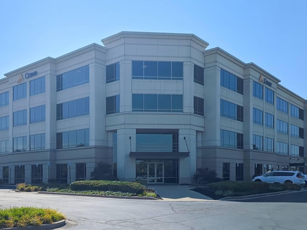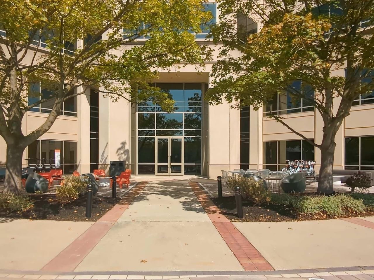 Keystone at The Crossing ist ein Gebäude, das für seine Umweltfreundlichkeit zertifiziert wurde, mit großen Fenstern, die natürliches Licht hereinlassen, und einer ruhigen Aussicht auf den See, die die Produktivität fördert.