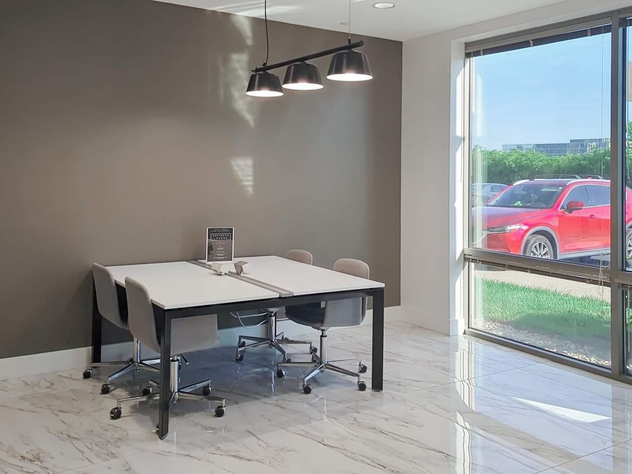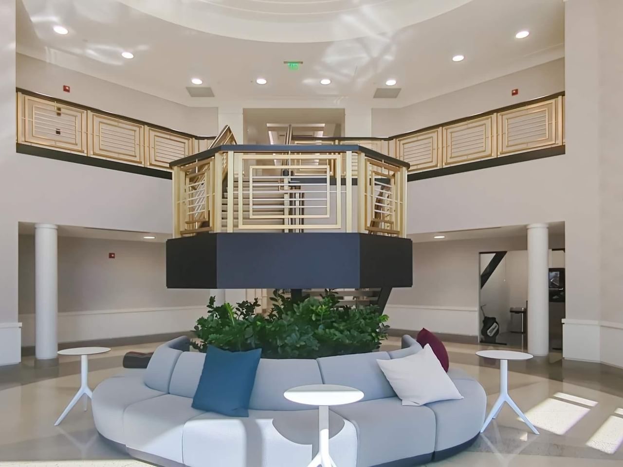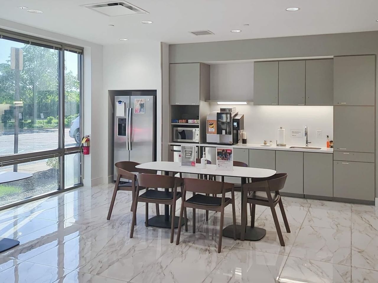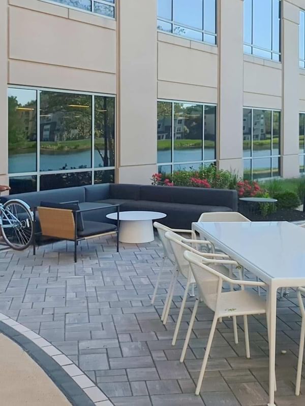 Keystone at The Crossing ist ein Gebäude, das für seine Umweltfreundlichkeit zertifiziert wurde, mit großen Fenstern, die natürliches Licht hereinlassen, und einer ruhigen Aussicht auf den See, die die Produktivität fördert.