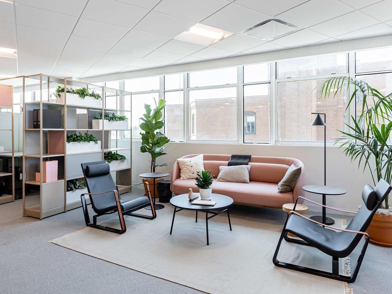 Machen Sie es sich in Ihrem modernen Arbeitsbereich mit ergonomischen Möbeln bequem und gönnen Sie sich eine Pause vom Bildschirm, indem Sie einen kurzen Abstecher in die voll ausgestattete Küche machen.