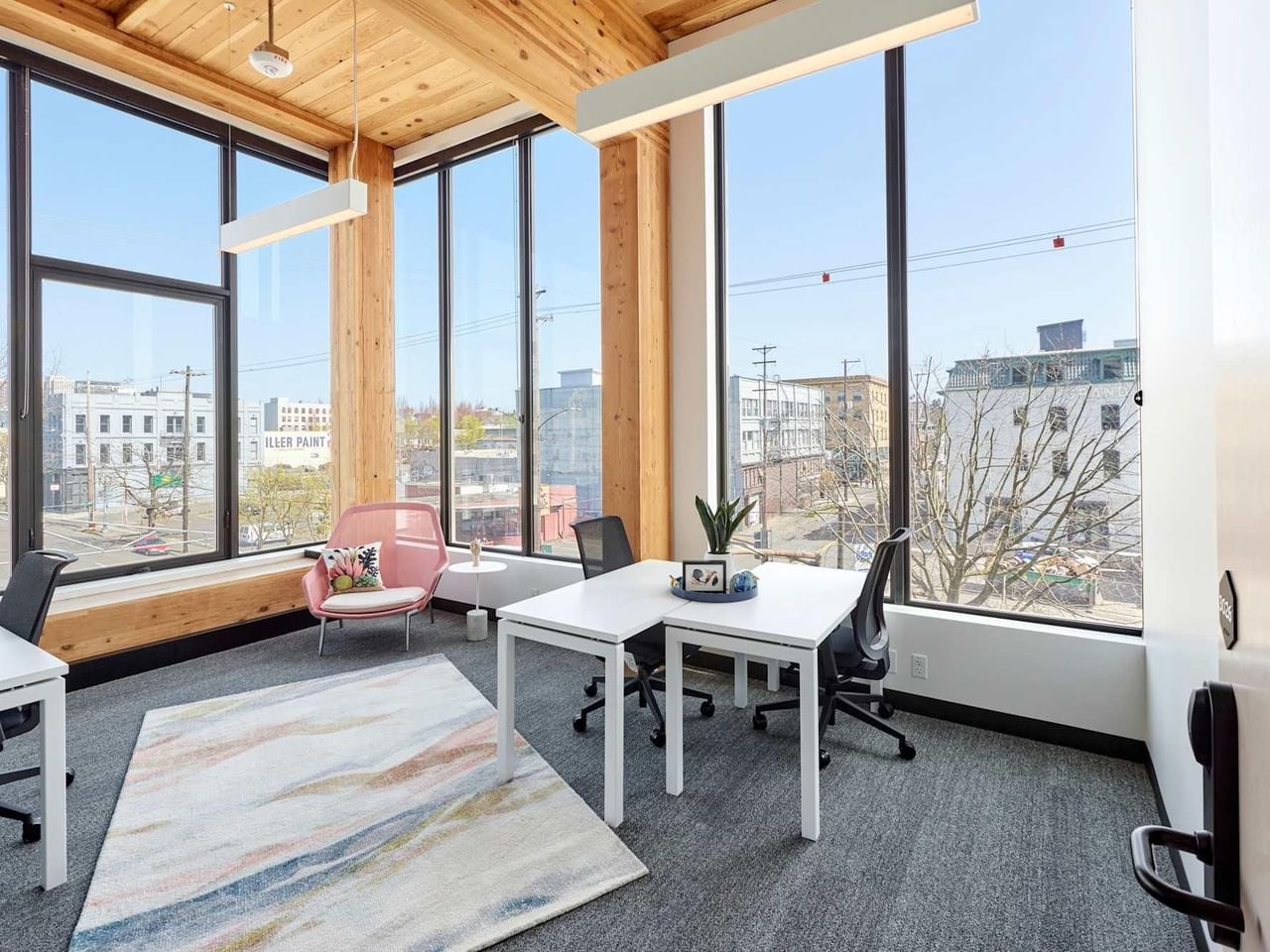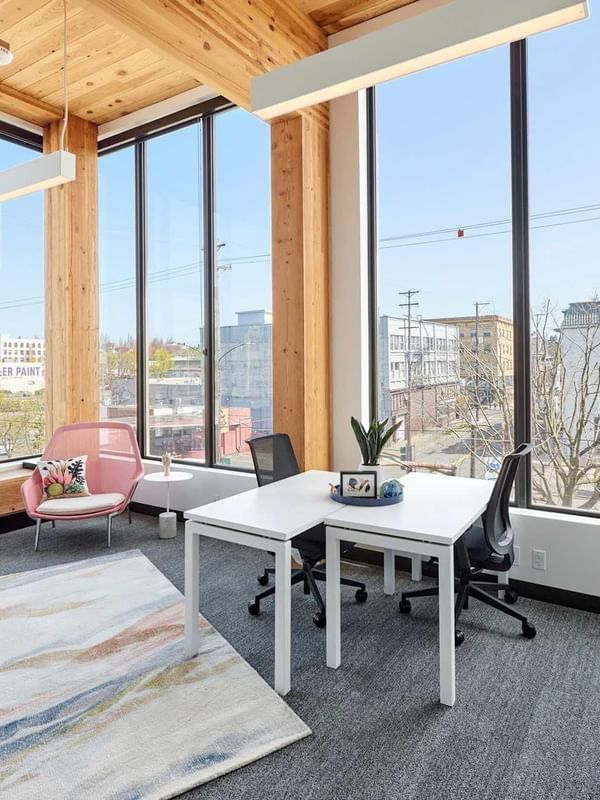 Machen Sie es sich bequem und bleiben Sie produktiv - Sie arbeiten mit Gleichgesinnten in diesem inspirierenden Büro mit unbegrenztem, superschnellem Wi-Fi und einem atemberaubenden Blick auf die Umgebung dank der raumhohen Fenster.