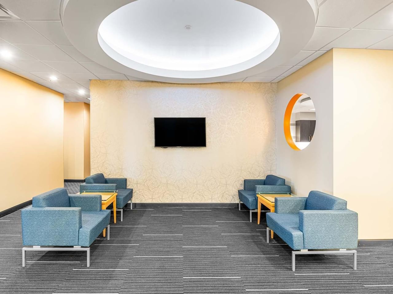 Das modern aussehende Gebäude zeichnet sich durch sein charakteristisches babyblaues Dach und seine Fenster aus, die das auffällige gelb-graue Innendesign ergänzen.
