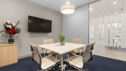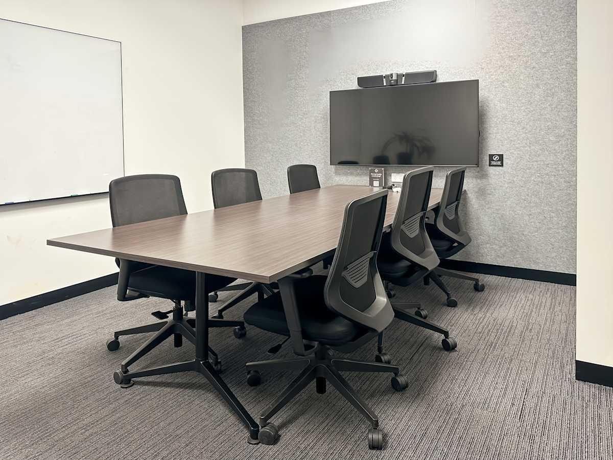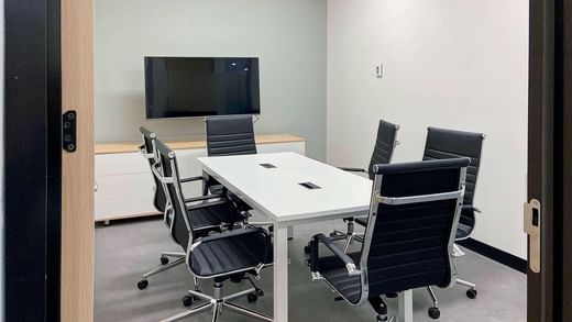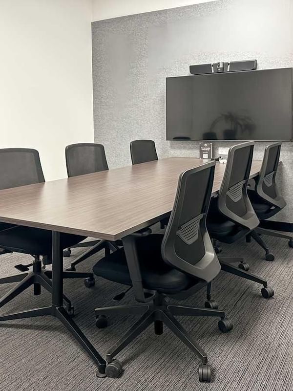 Pitch ideas in furnished meeting rooms with widescreen TVs and window views for great presentations.