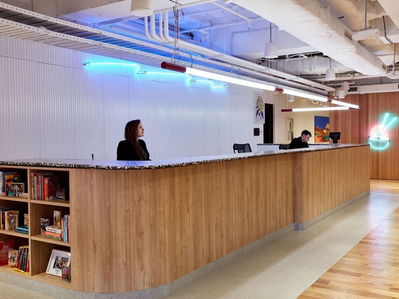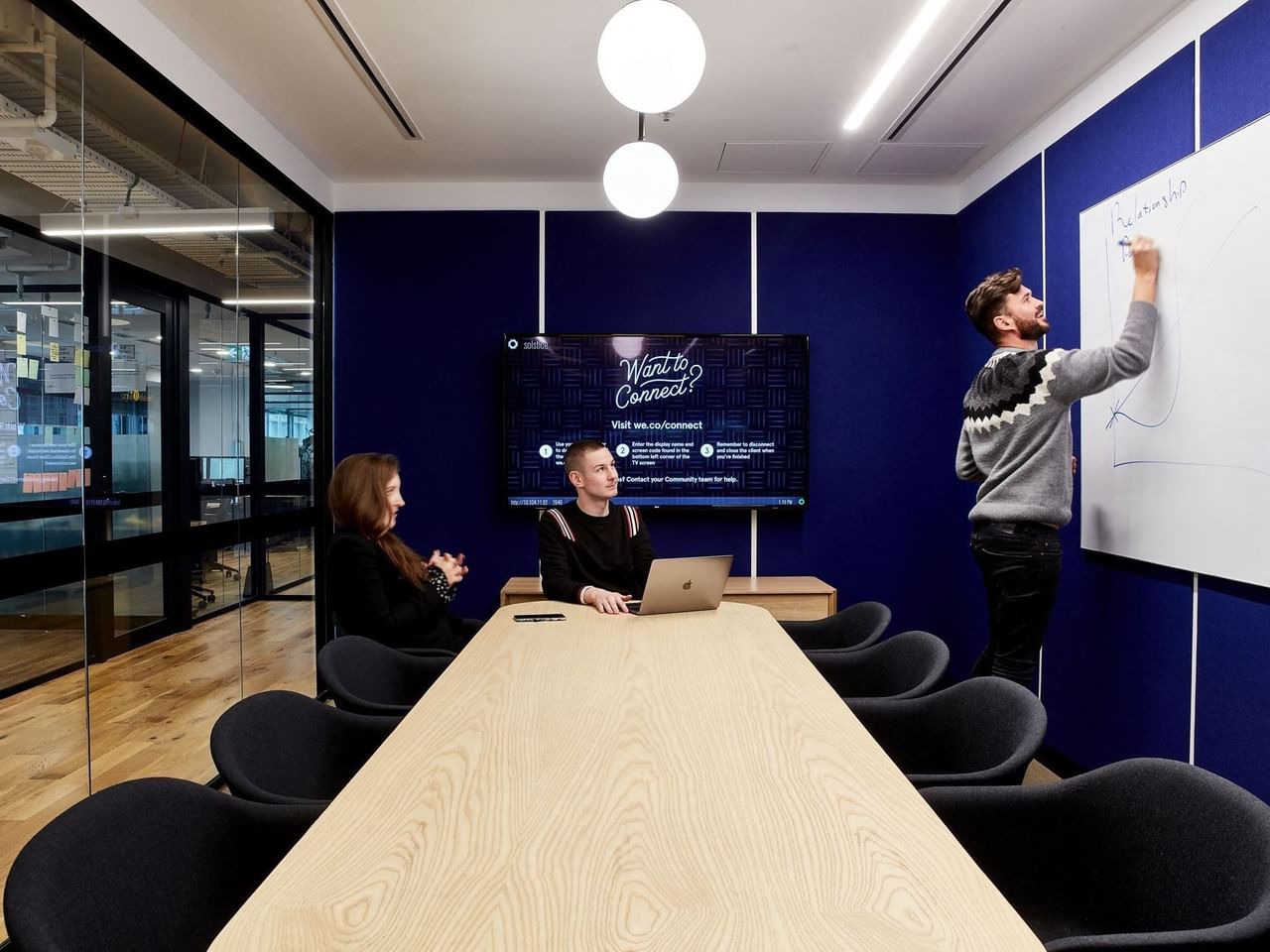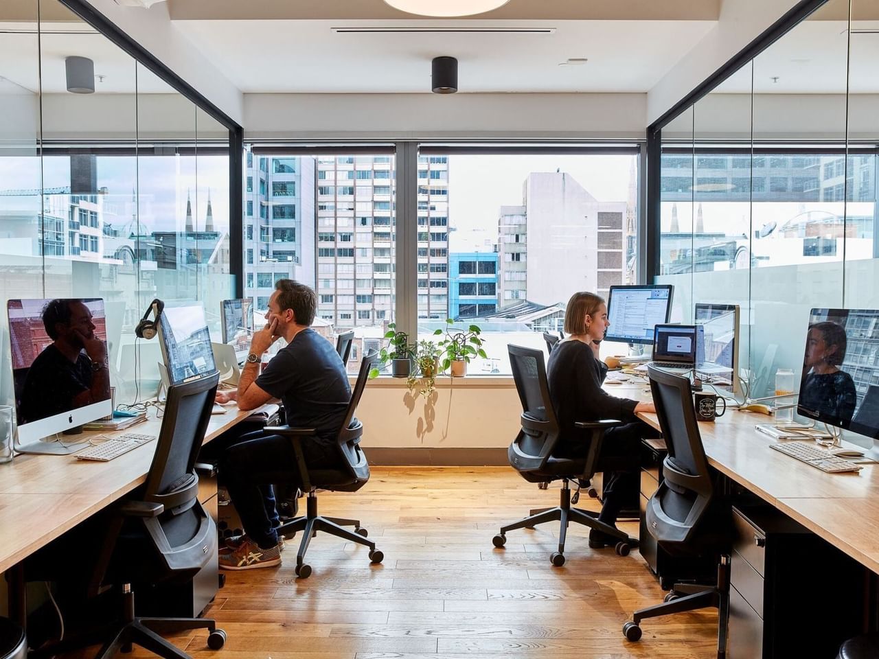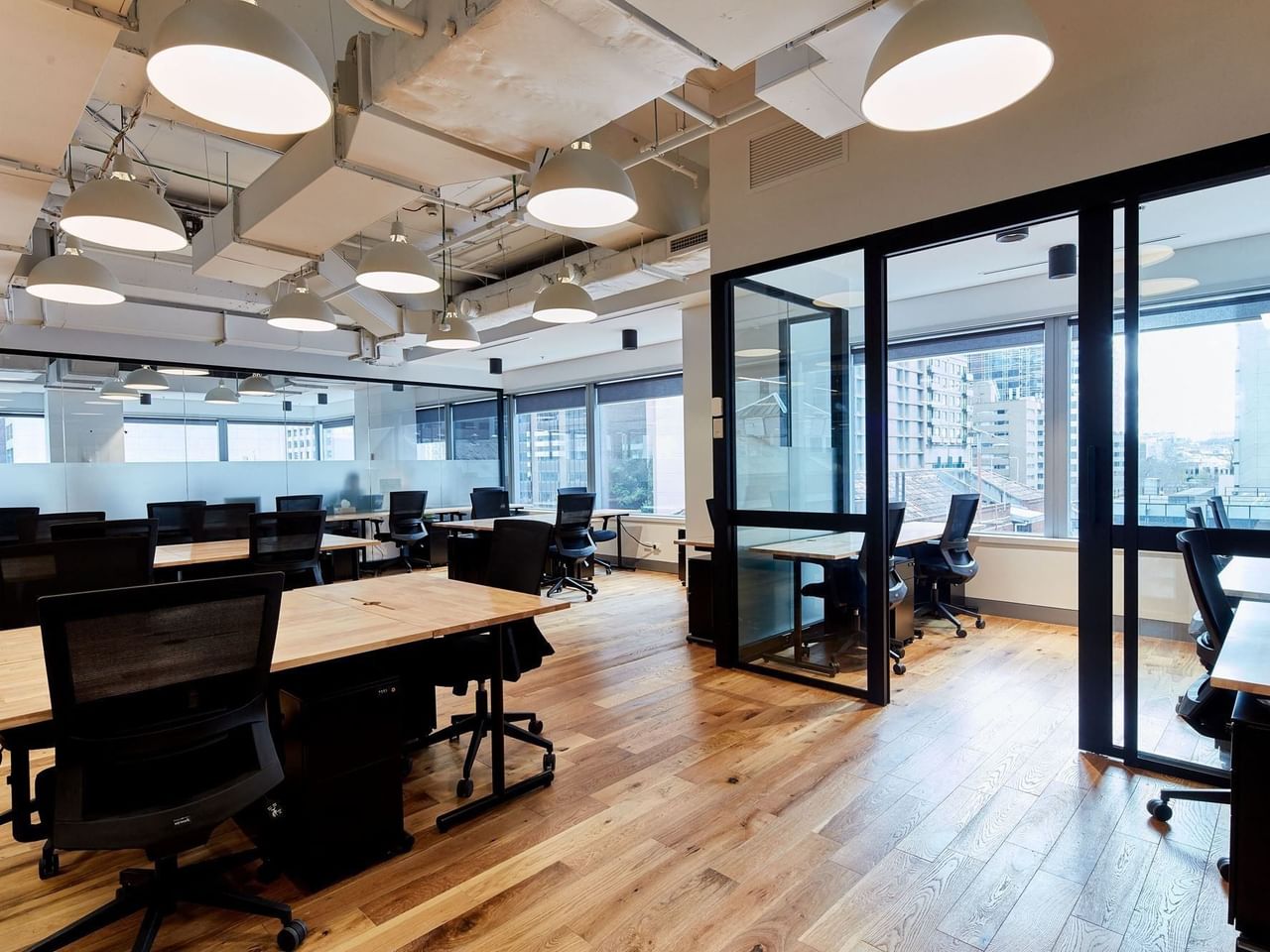 Spanning three floors in a modern glass-walled building, this space creates a unique and collaborative work experience.