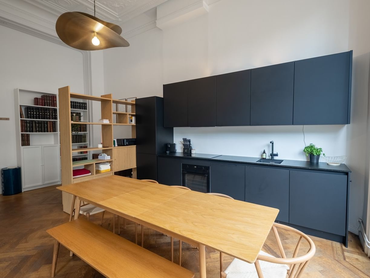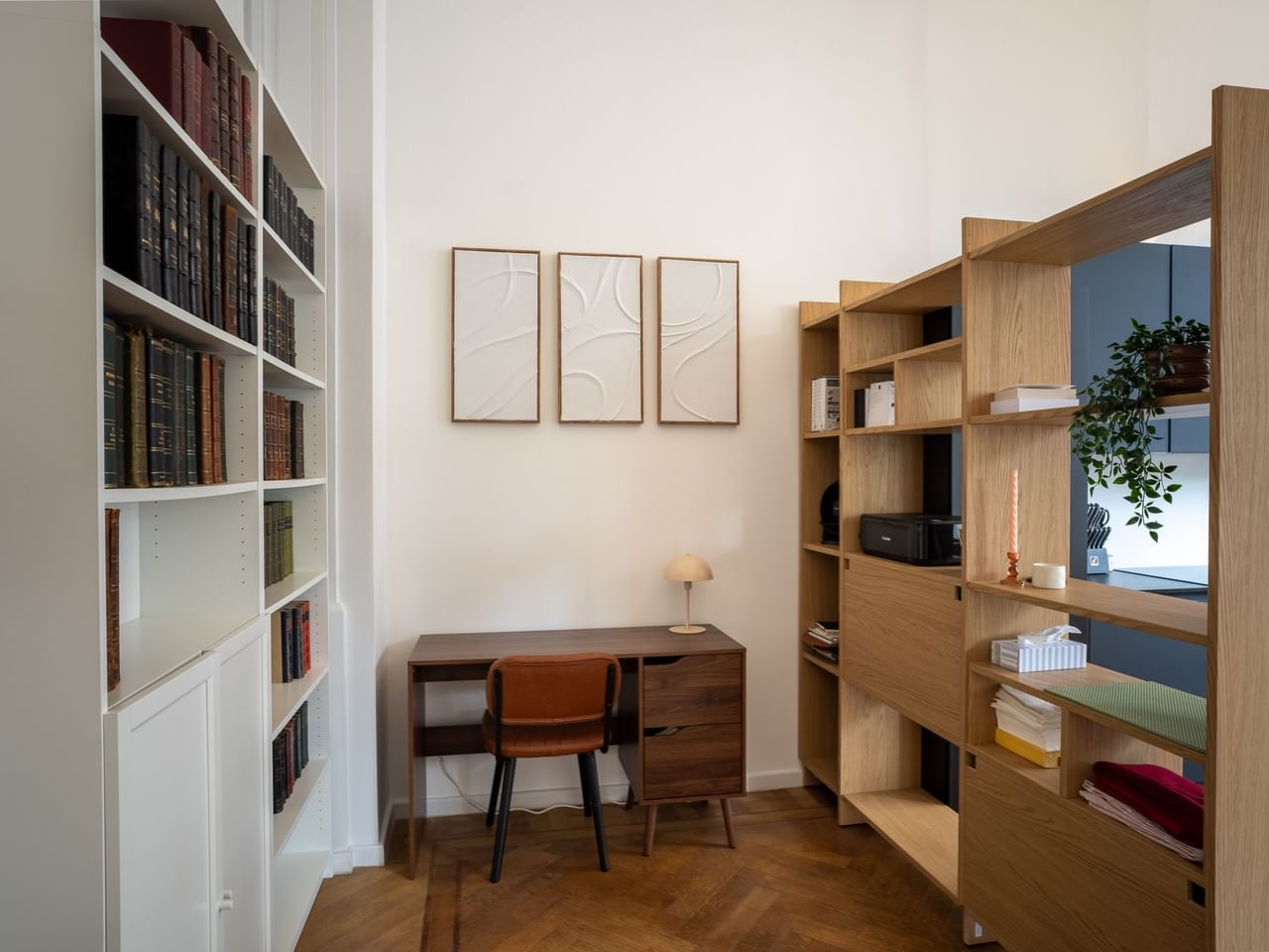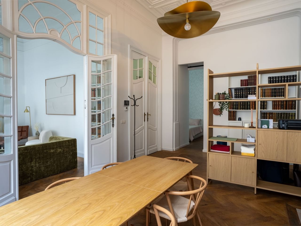 The dining table can seat up to 10 people, and an equipped office (high-speed internet, printer, scanner) is located in a semi-open space near the dining room.