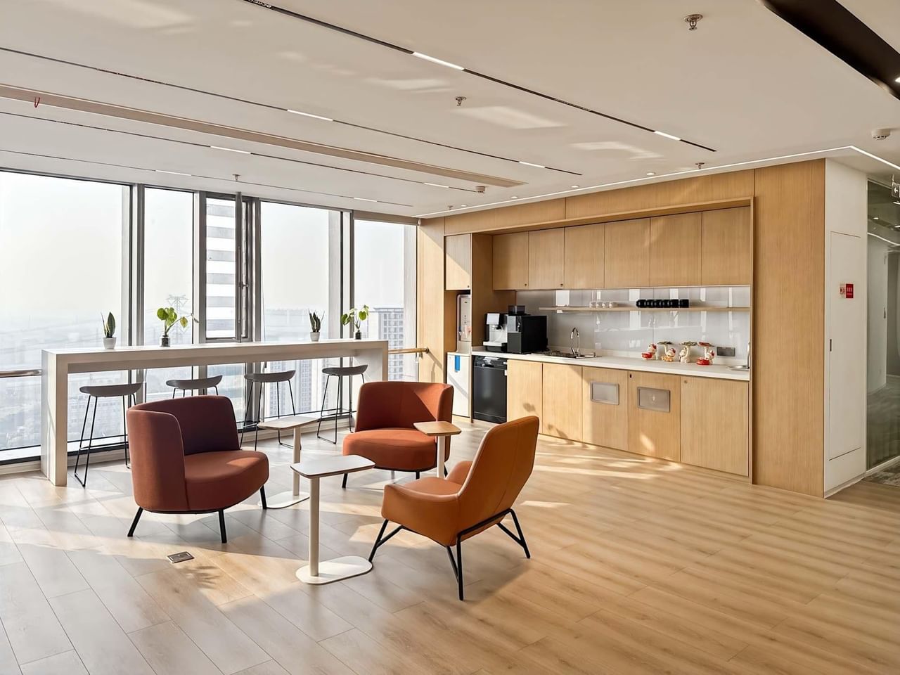 Inside, a polished lobby area makes way for vast, spacious offices, where floor-to-ceiling windows allow natural light to flood each room.