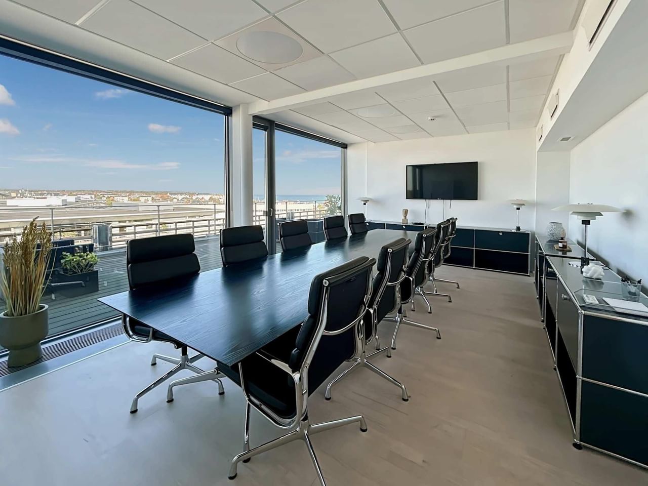 Host meetings in ultra-modern workspaces, where vast windows and light wood flooring enhance the sense of space and style.