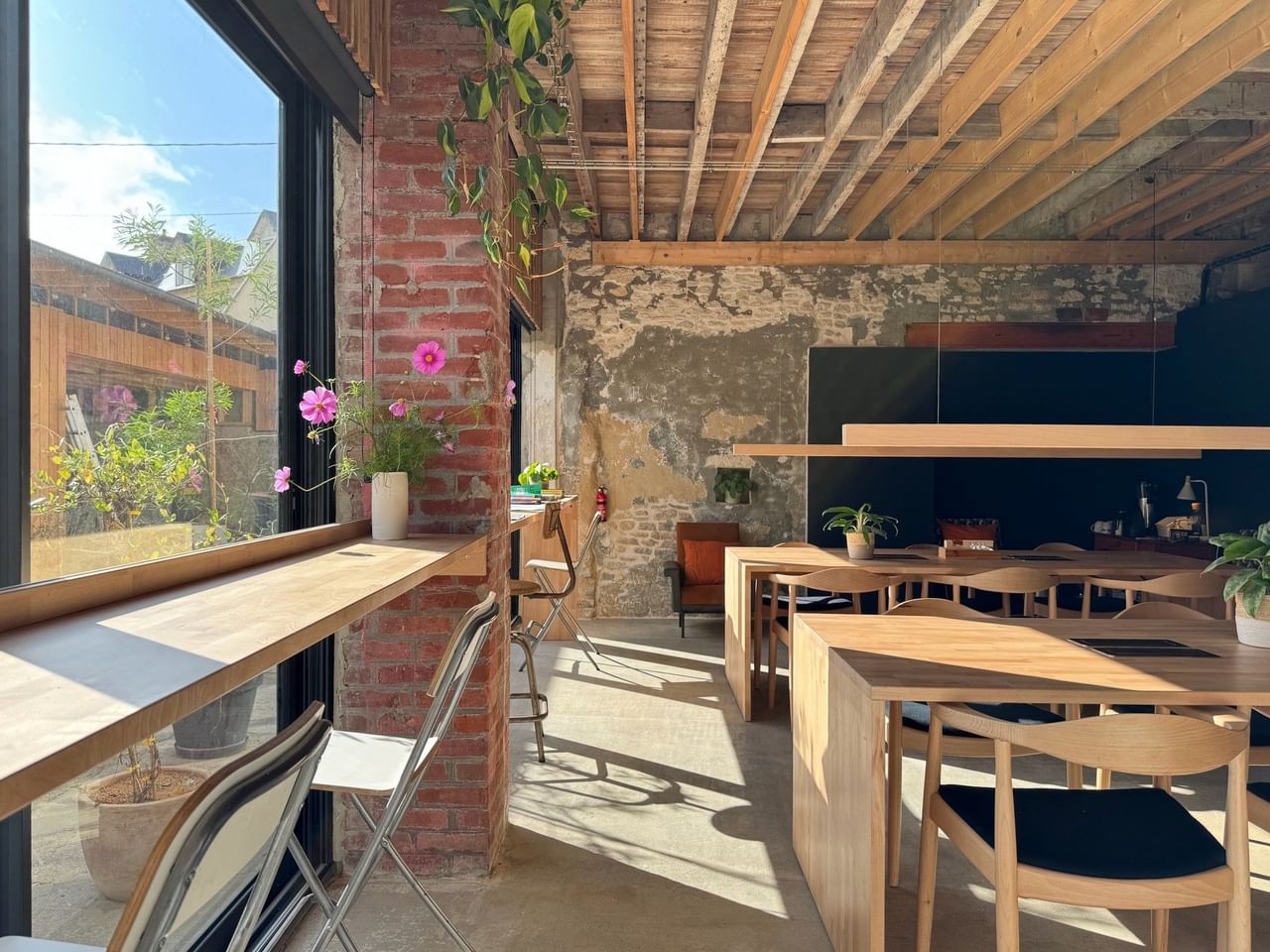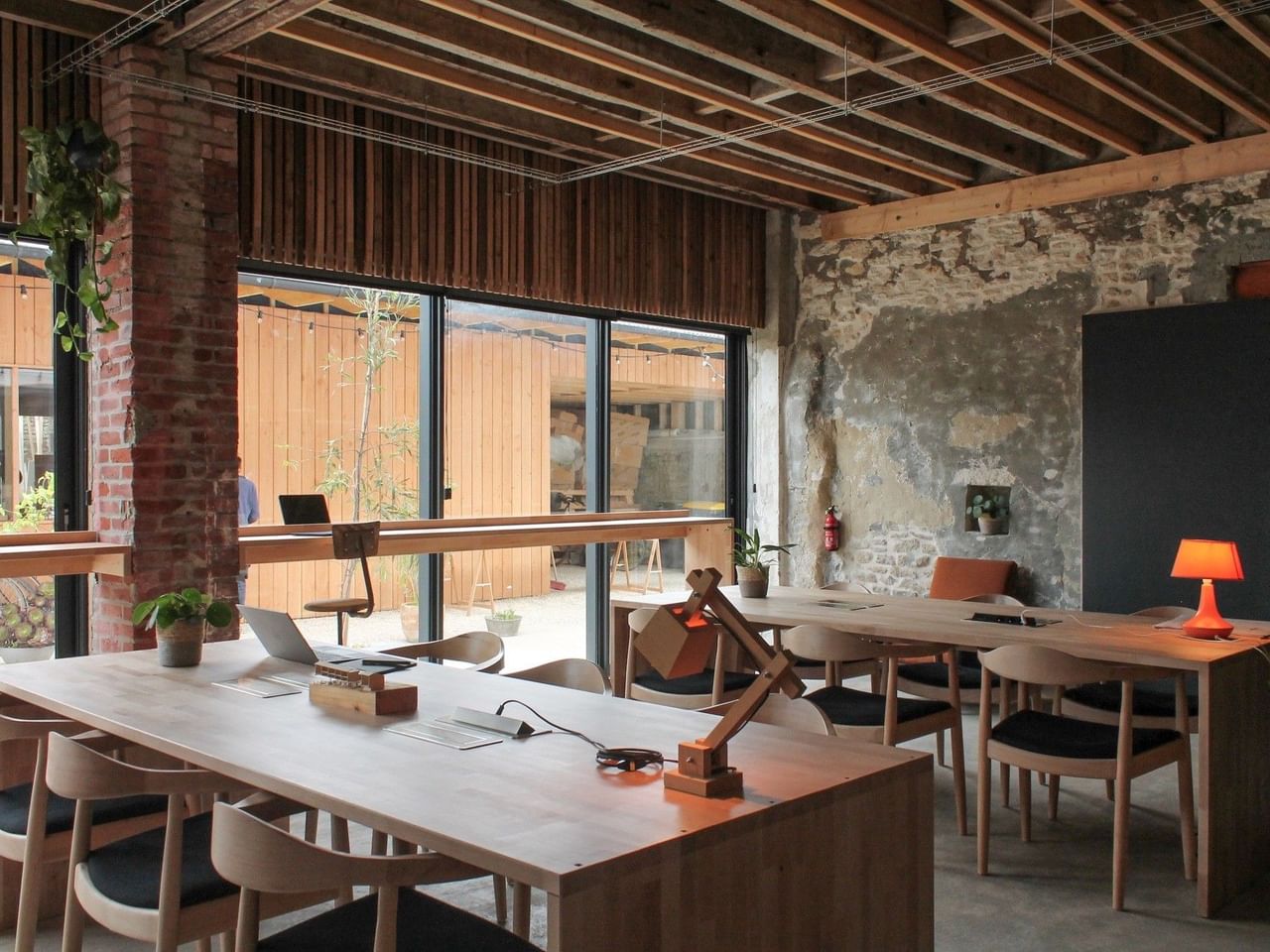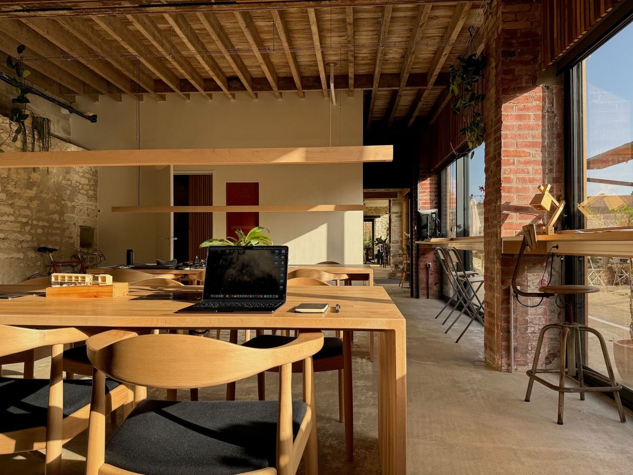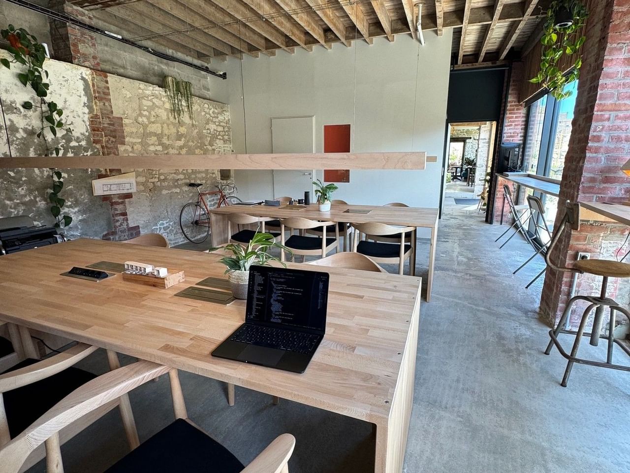 The space, bathed in natural light thanks to large bay windows, accommodates 20 open-space workstations: 12 seated workstations spread over two large wooden tables and 8 standing desks along the windows.