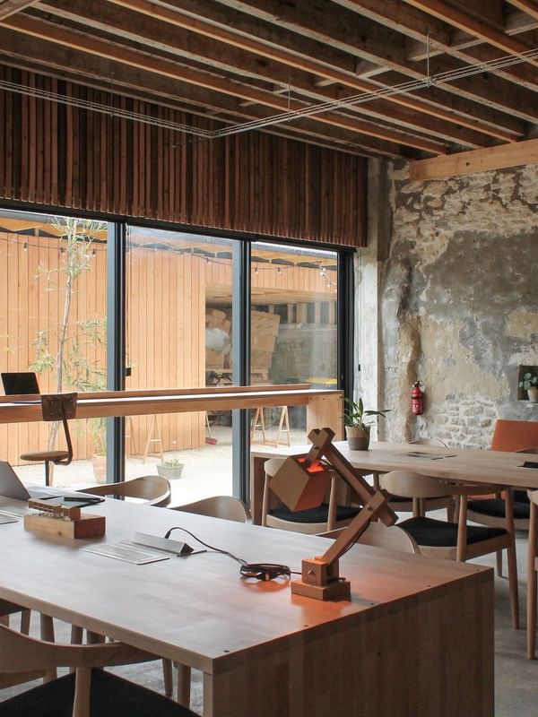 All the furniture was designed and custom-built in our wood workshop, using raw materials to create a warm atmosphere conducive to concentration.