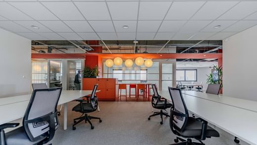 The 250 m2 first floor has been fitted out as a loungework area, combining sofas, armchairs, coworking stations, a phone booth and a fully-equipped kitchen for maximum working freedom and comfort.