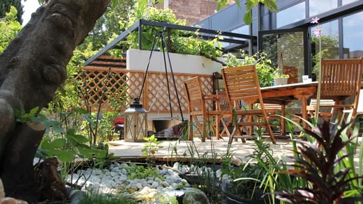 Old stones and asserted design, comfortable spaces, open space with a view on outdoor spaces with trees, reception with concierge service, numerous parking spaces, everything has been thought for the best of comfort and the requirement of serenity.
