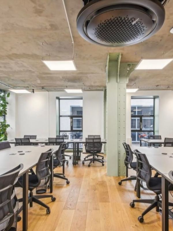 Located in the 10th arrondissement of Paris, Faubourg Saint-Denis offers vast workspaces on three floors. In an industrial style, with its reinforced concrete columns and glass roofs, this is the ideal place to work out of time. The first floor features a vast open space divided by glass walls, with 78 workstations, 5 meeting rooms, 1 boardroom, 1 kitchen-refectory and 3 phone boxes. On the 1st floor, you'll find a lounge area with a gilded leather sofa, 34 open-plan workstations and a fitted kitchen. The top two floors feature a large designer terrace, 42 workstations, 3 meeting rooms and a lounge area.