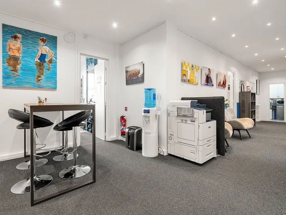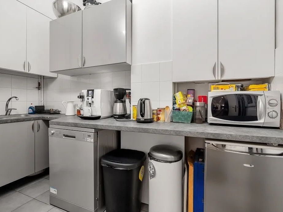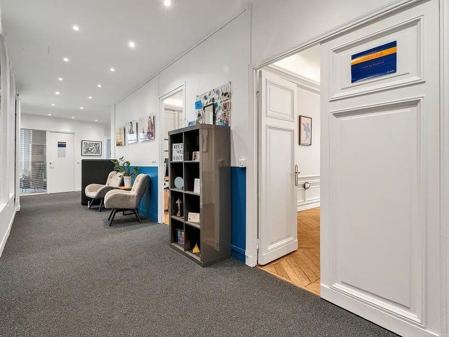 It includes an open space and a private meeting room, complemented by a shared kitchenette, for a practical and collaborative work experience.