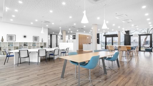 In these white offices with color accents, you can concentrate on your work and take advantage of the on-site parking and coffee bar.