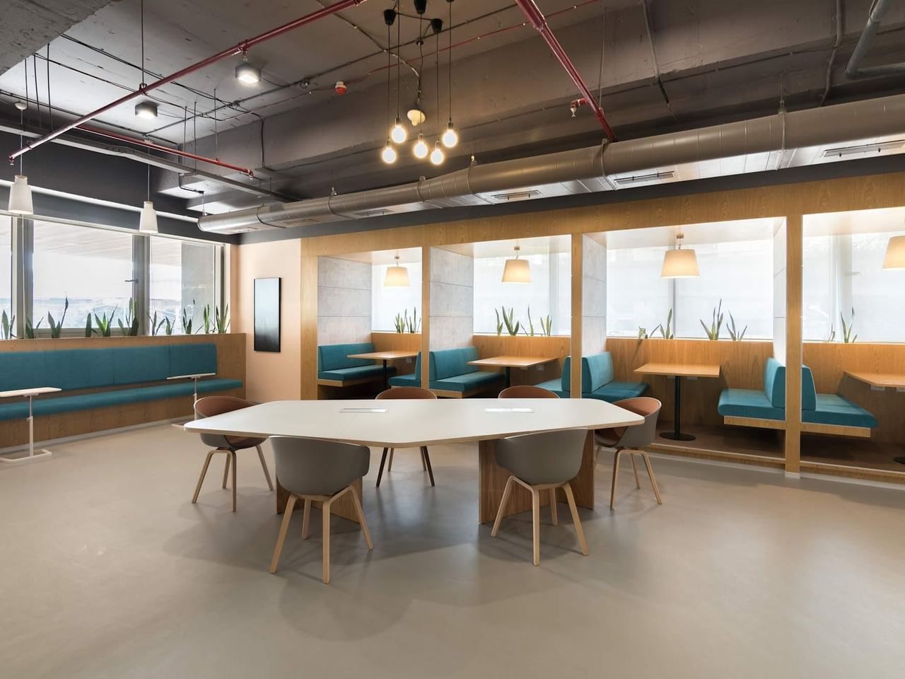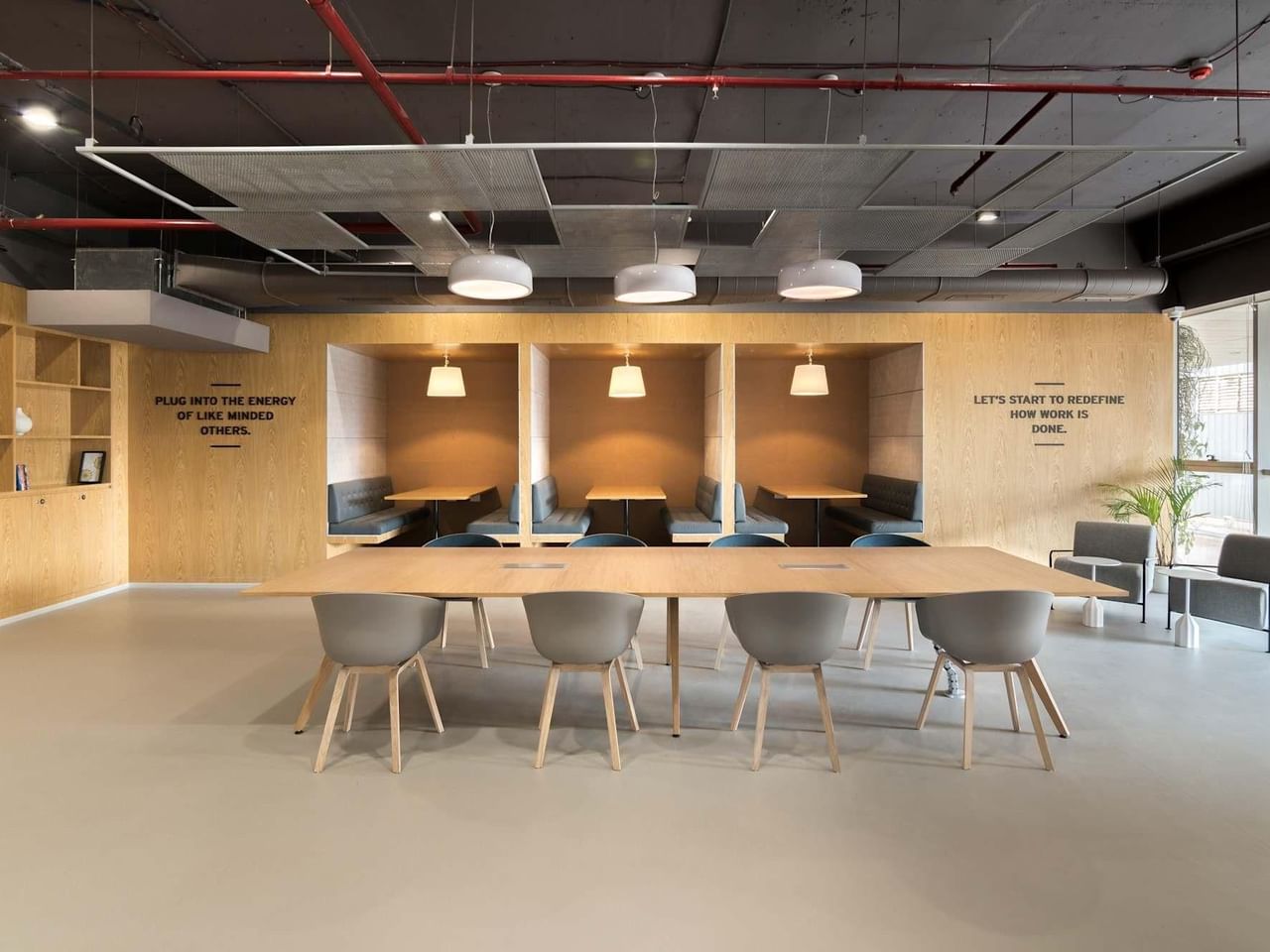 Inspire Hub houses light-flooded rental offices, co-working stations and meeting rooms spread over three floors, as well as a café and shops on the ground floor.