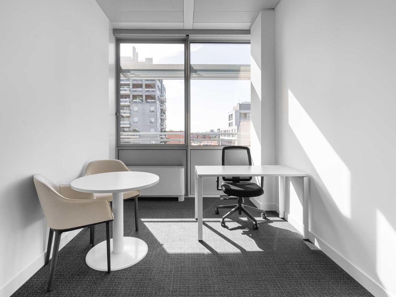 This striking workspace blends contemporary design with floor-to-ceiling windows for a bright, airy atmosphere that inspires focus.