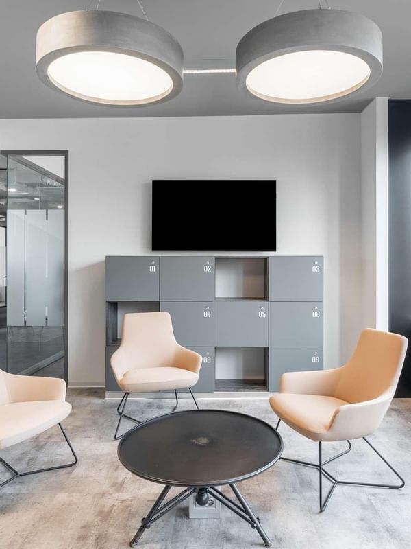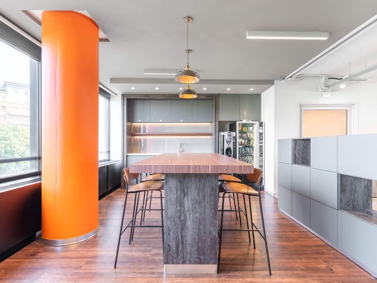 Gather your thoughts at the coffee bar or in elegant breakout areas with glass screens and chic light fittings.