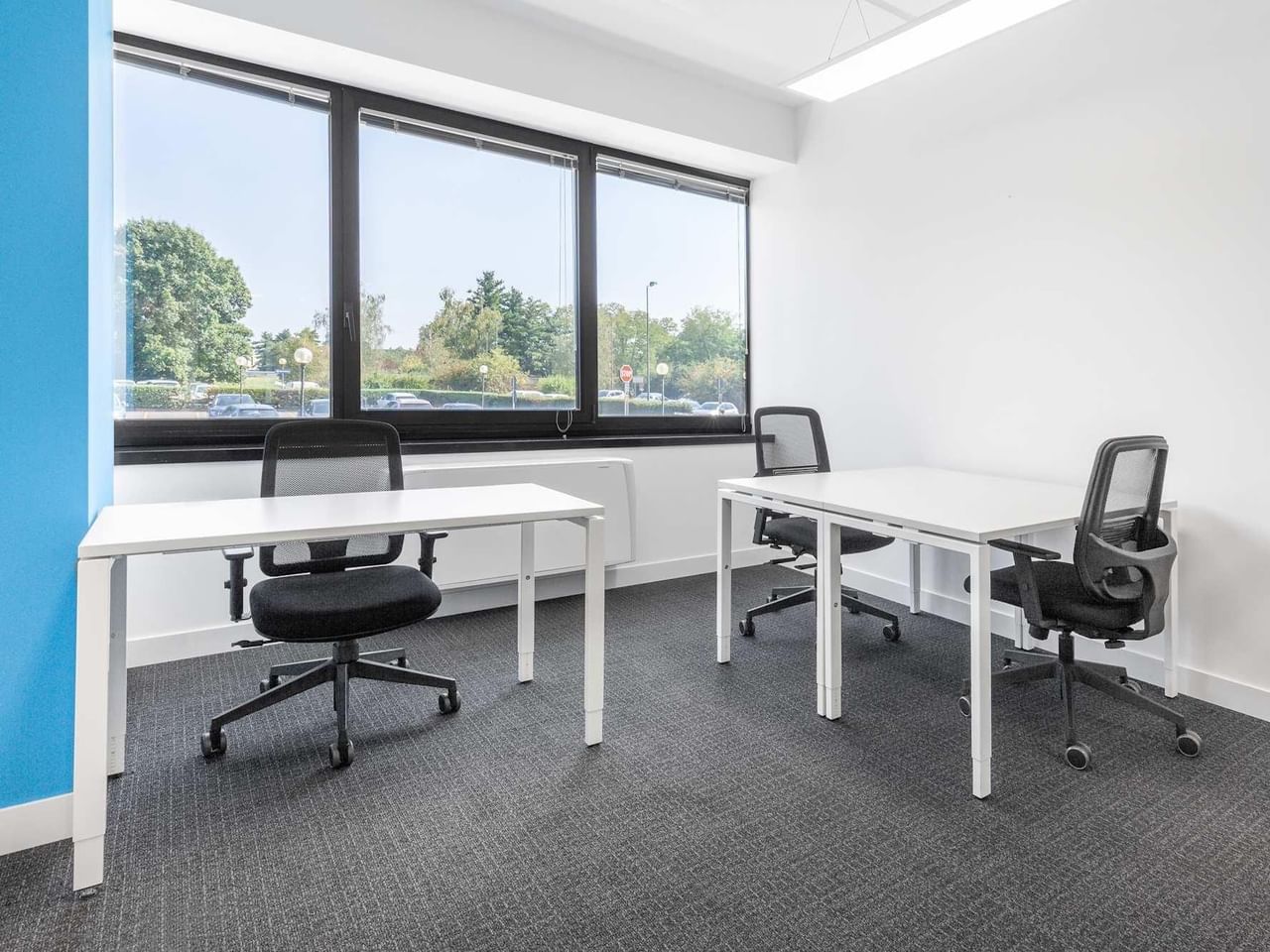 Focus on deadlines in the uncluttered workspaces with clean white furniture and calming views over the landscaped park and water features.