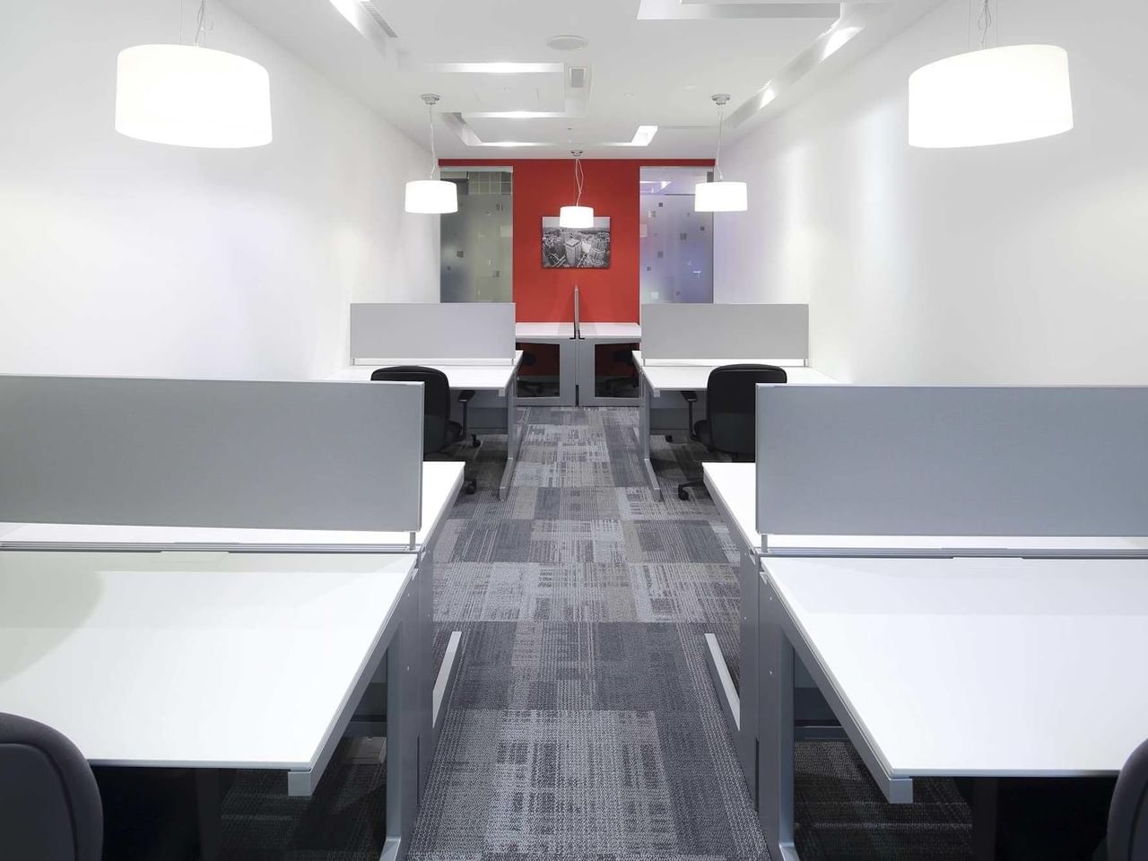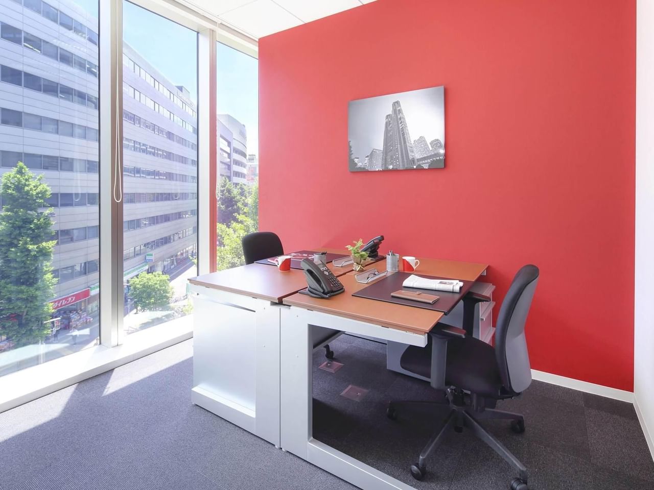 Capture attention in our bright modern workspace with energising red accents, filled with natural light from impressive floor-to-ceiling windows.