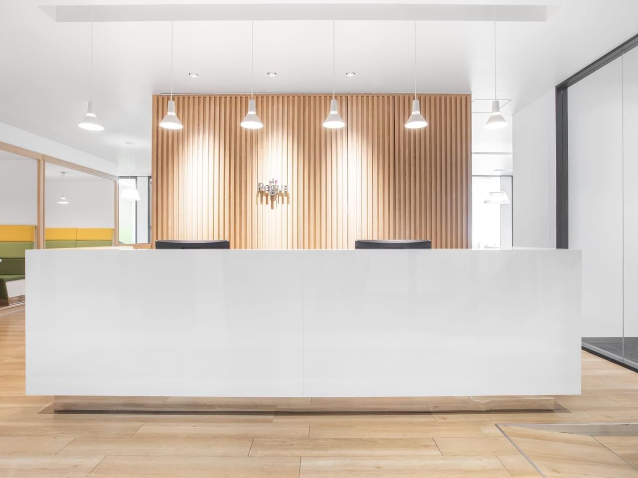 Fresh colours and contemporary furnishings give this workspace a dynamic and welcoming atmosphere with plenty of light.