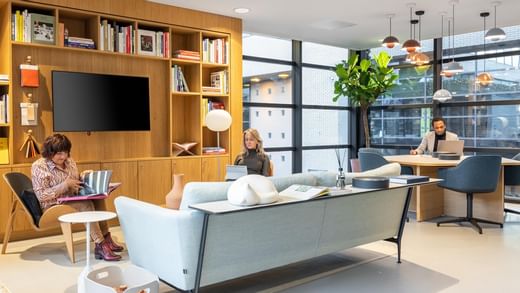 This multifunctional space with approx. 100 seats can be used for lunch, flexible workstations and/or informal consultations. There are also three meeting rooms (4 persons, 10 persons and an auditorium for larger meetings).