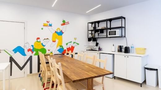Over time and through feedback from our coworkers we decided to develop the concept and create more private rooms, more spaces for calls, and a very special space for our breaks and conversations, Meet.
