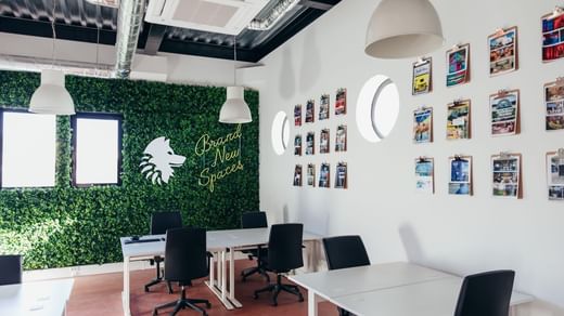 This contemporary workspace features high-speed internet, private meeting rooms, and inviting communal areas designed for collaboration and networking.