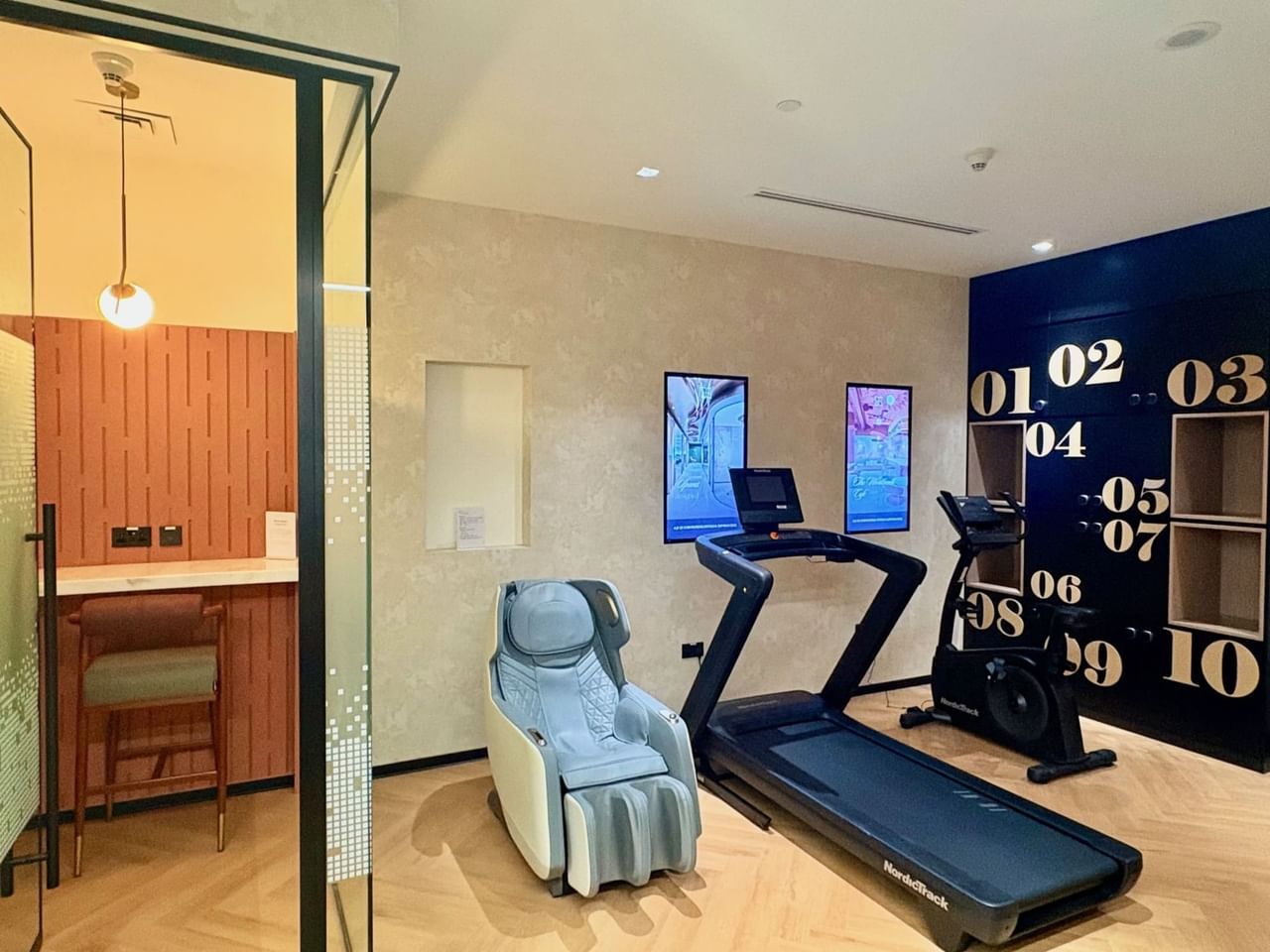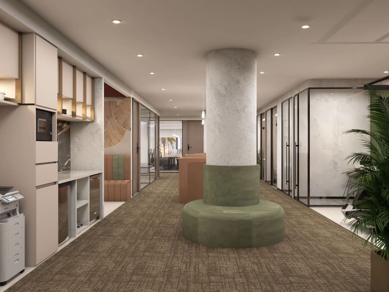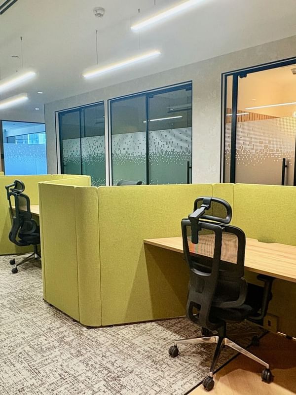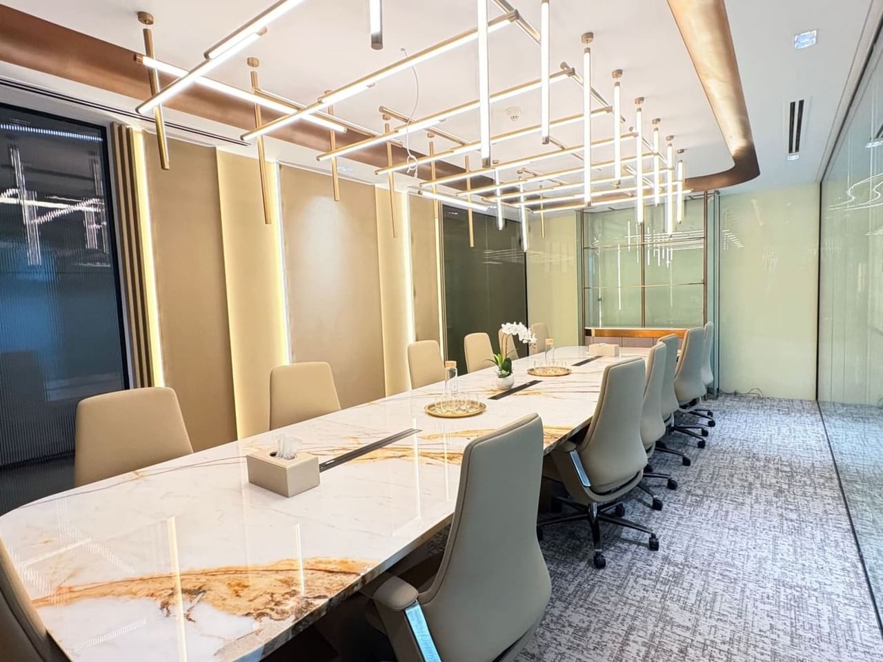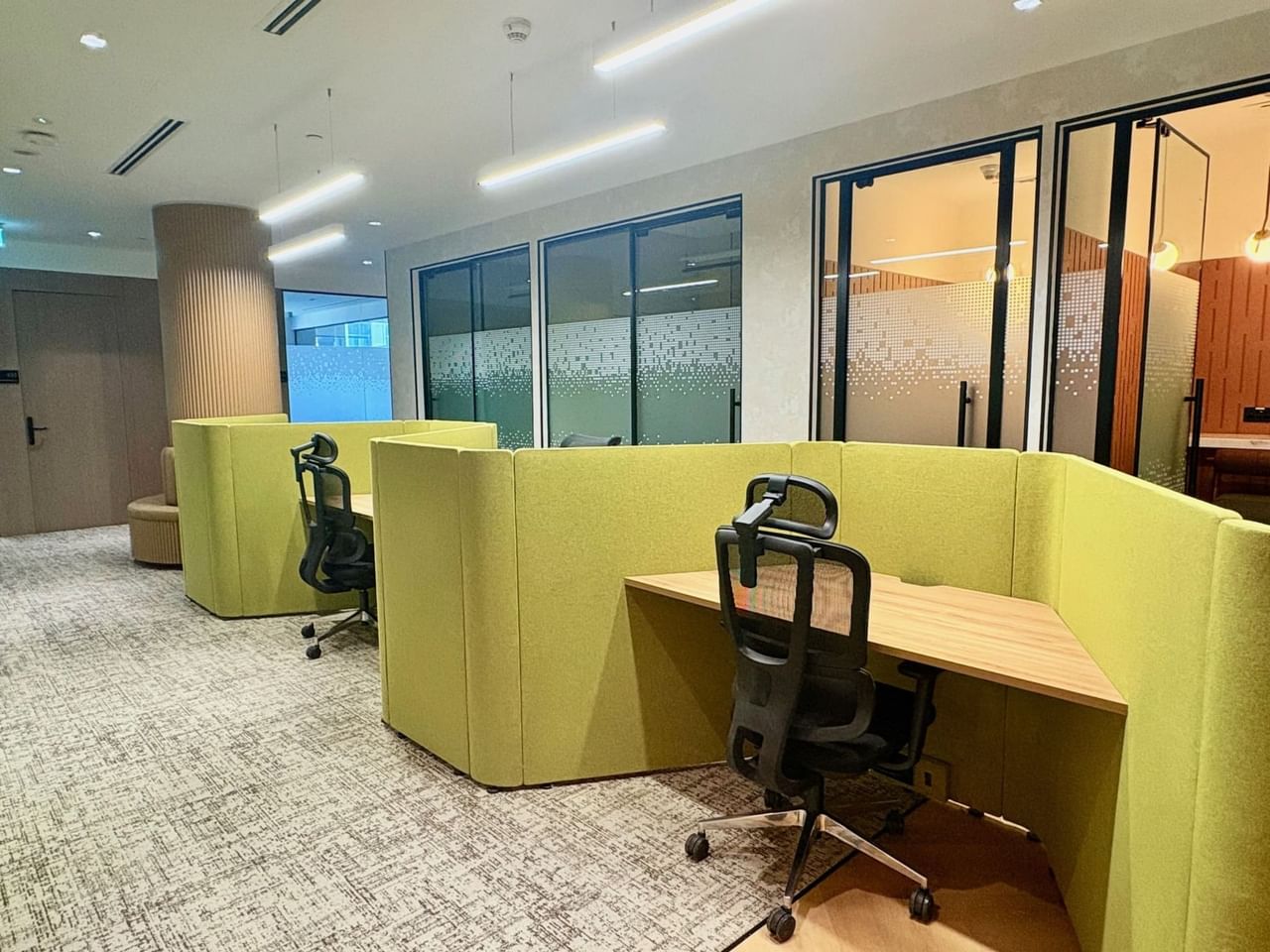 The center also includes: in-house coffeeshop with a private barista and a selection of premium coffee beans, wellness zone equipped with a treadmill, an exercise bike, and a massage chair, soundproof phone booths for private calls, meeting rooms for 5–15 people, fully equipped with the latest tech.