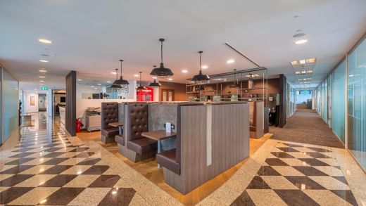 Floor to ceiling windows offer plenty of natural lighting, while the in-house coffee bar provides space for informal get-togethers.