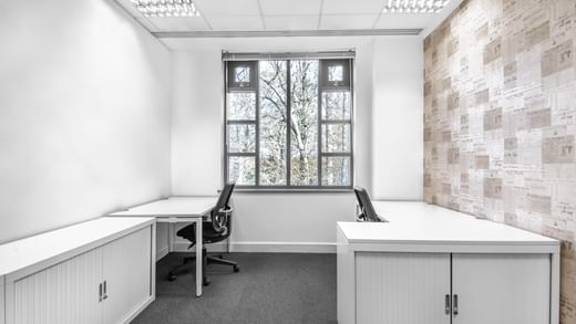 Mature landscaped grounds surround the building, with contemporary workspaces, including dedicated meeting rooms and conference areas, inside.