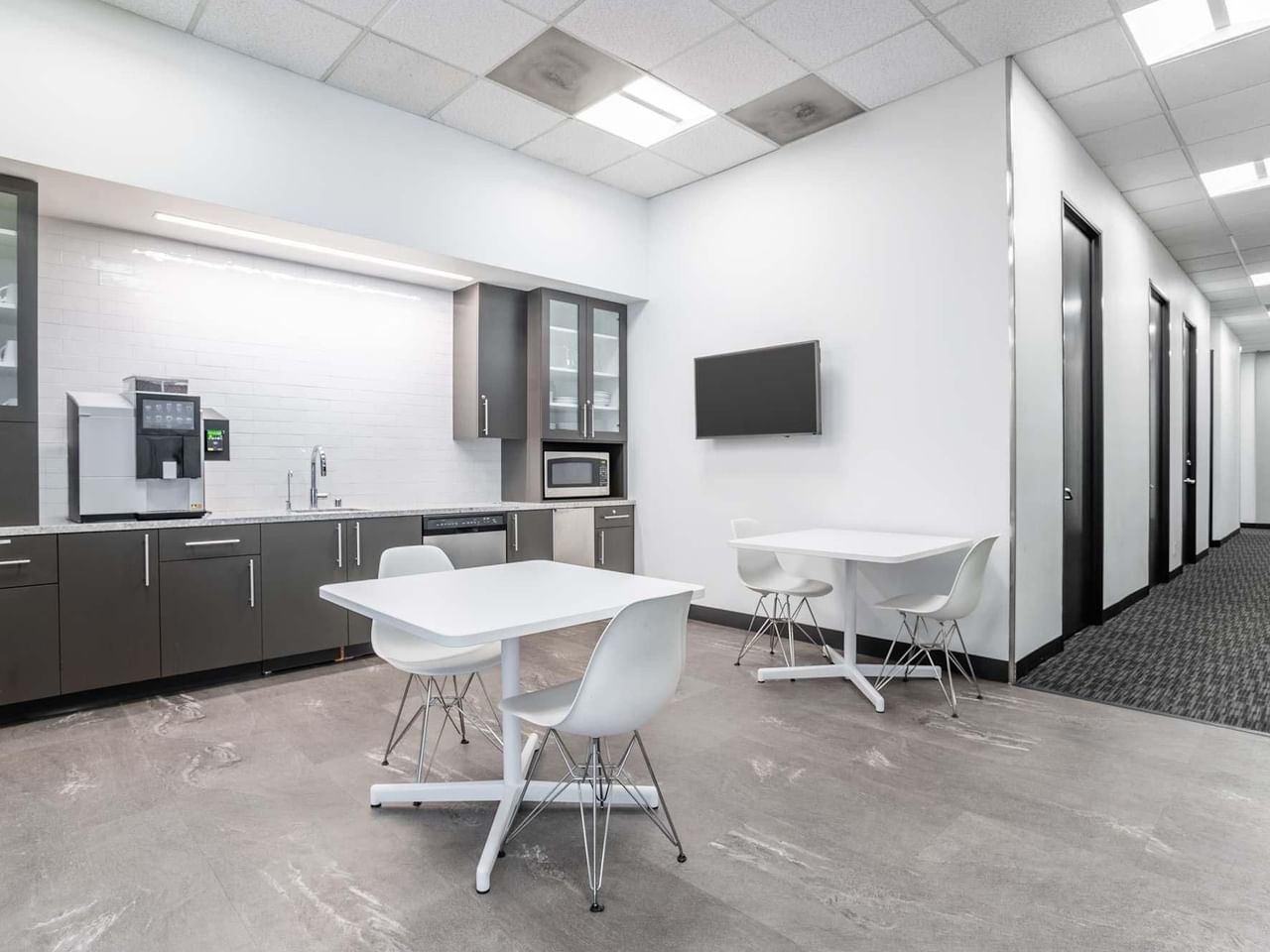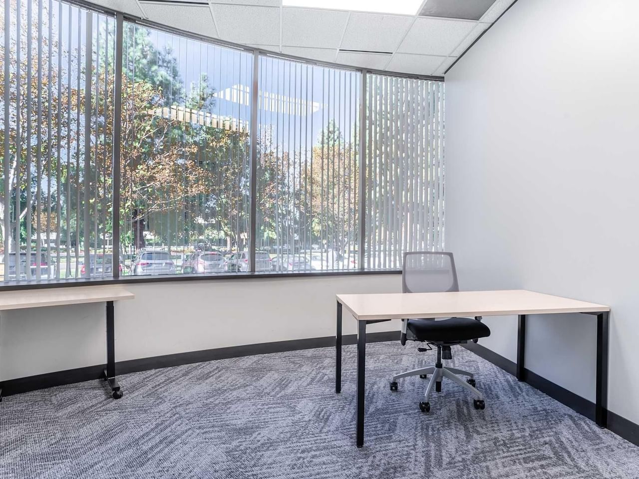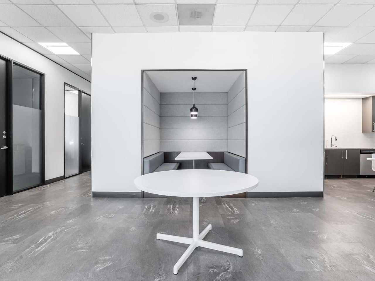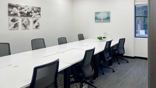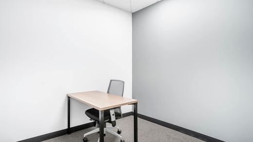 Housed within a futuristic white building with black tinted windows, enjoy access to buzzy coworking space, quiet private offices, plus a gym and fitness room.