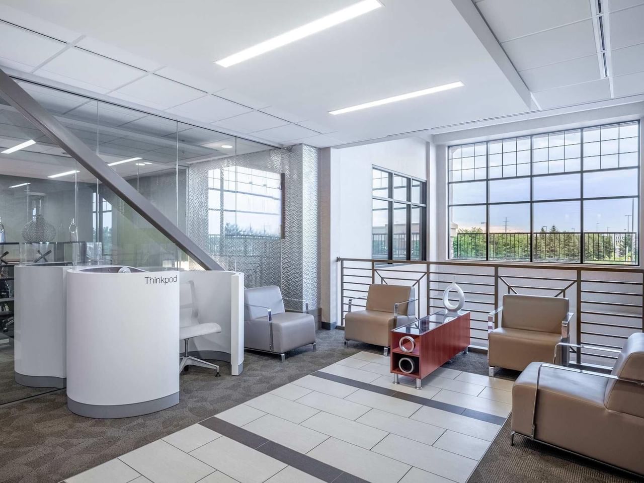 Glass walls and large windows let light flow through the modern offices, creating a tranquil work environment.