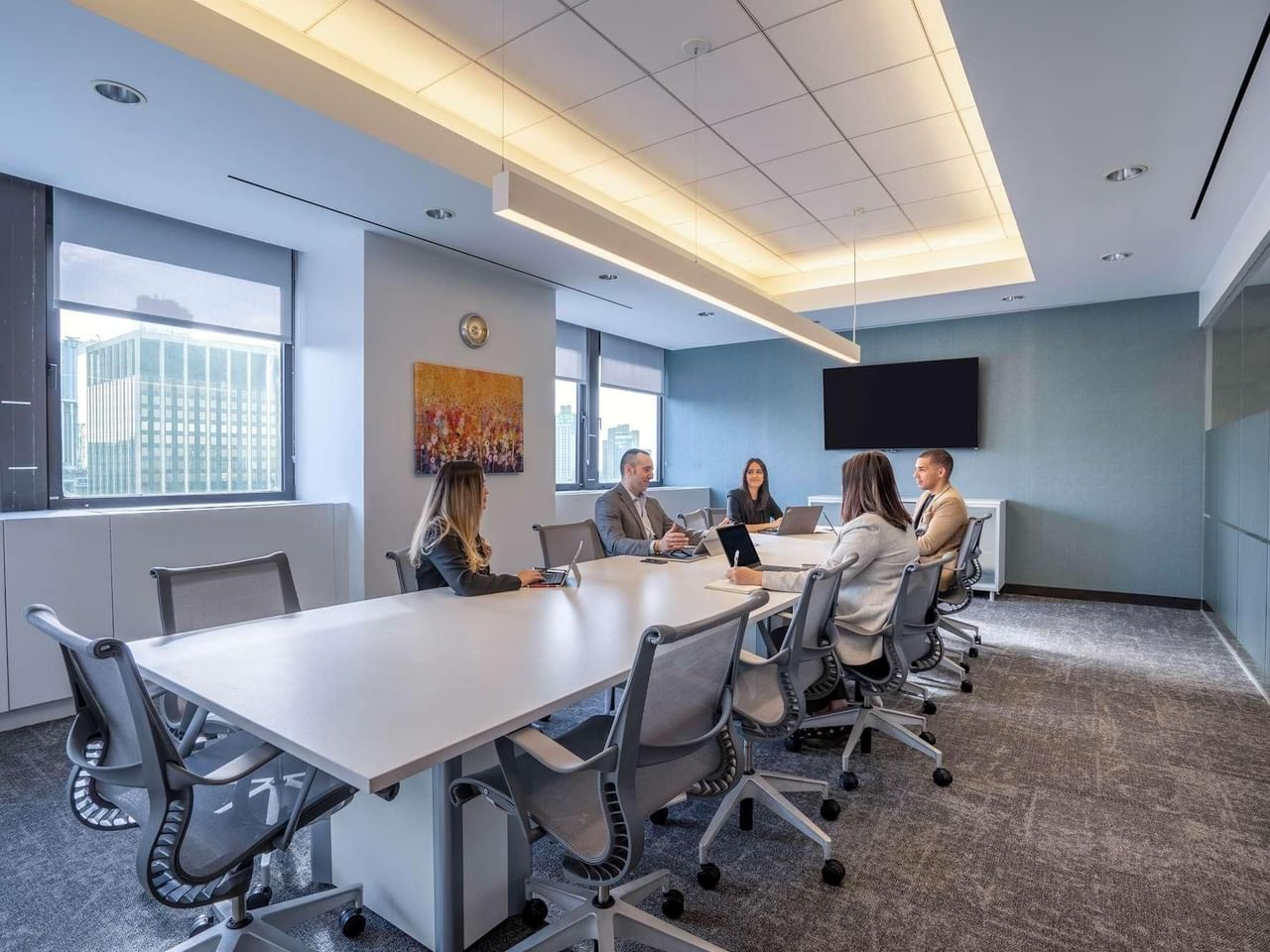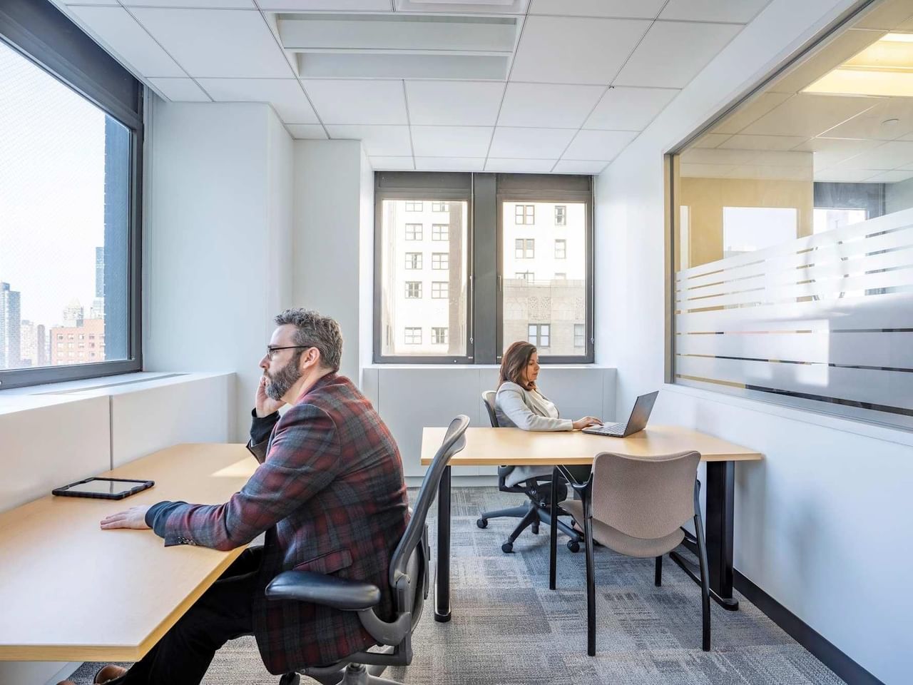 Large floor-to-ceiling windows provide plenty of natural light to boost productivity, with views over Manhattan’s skyline.