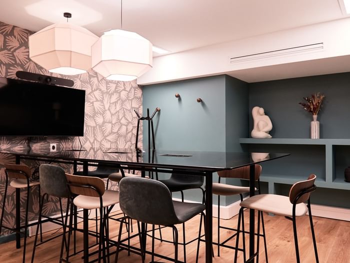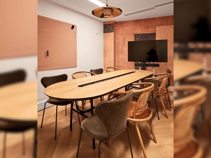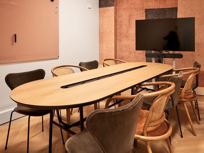 | Classic equipped room | 2 to 10 people | Paperboard, digital screen, high-speed wifi | Round table, U or theater layout |