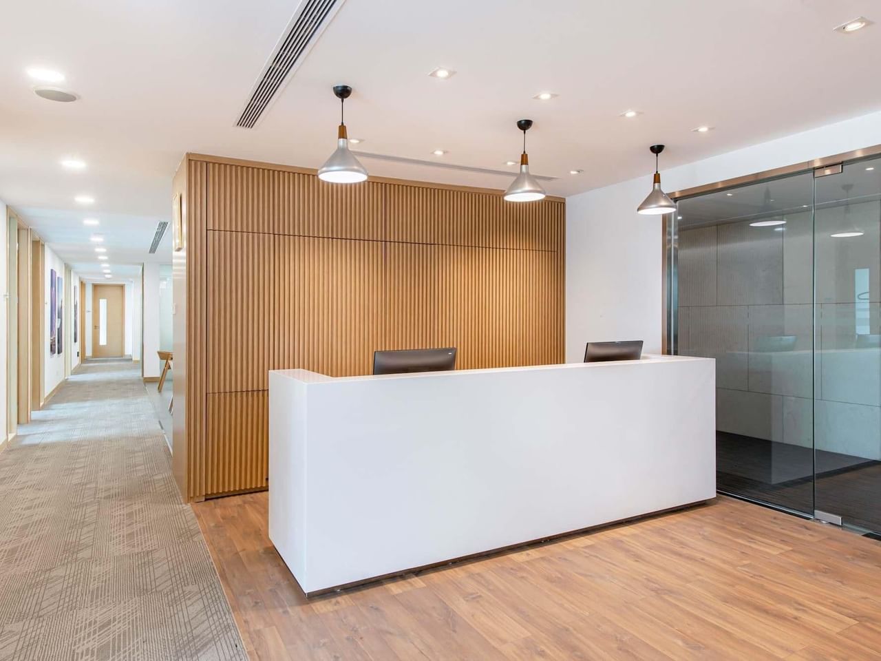 Este imponente edificio de cristal ofrece interiores modernos y luminosos con ventanales que van del suelo al techo.