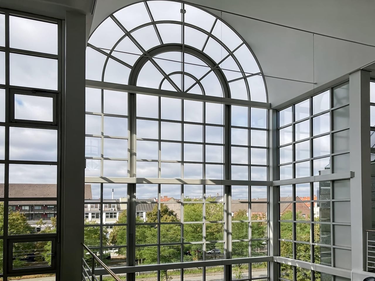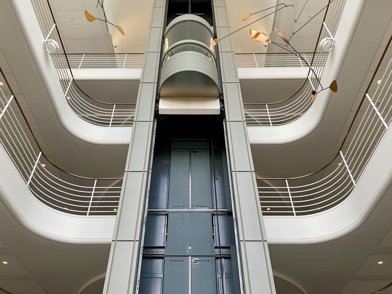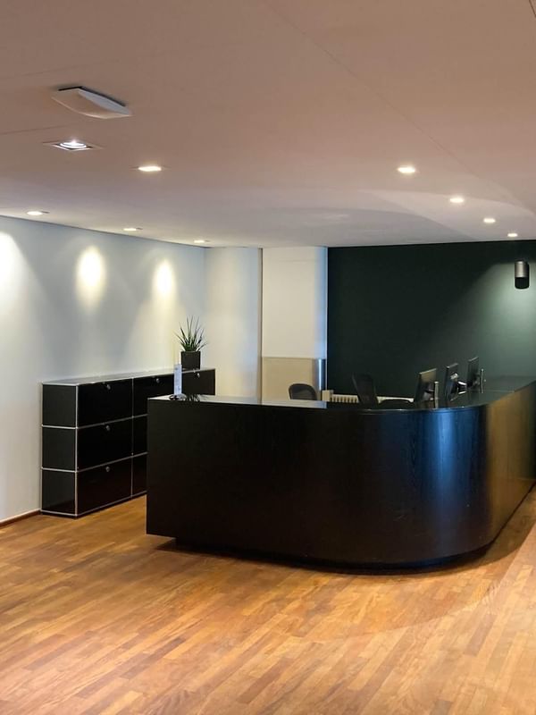 Reciba a sus invitados en el imponente atrio central antes de subir en el ascensor de cristal a una elegante sala de reuniones con suelos de madera oscura y elegantes muebles de diseño.