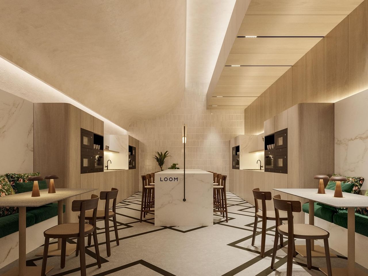 LOOM Azca transmite sobriedad, armonía y serenidad, recurriendo a materiales naturales y tonos neutros. Jugando en los núcleos interiores con grandes jardines donde suceden los encuentros más sociales.